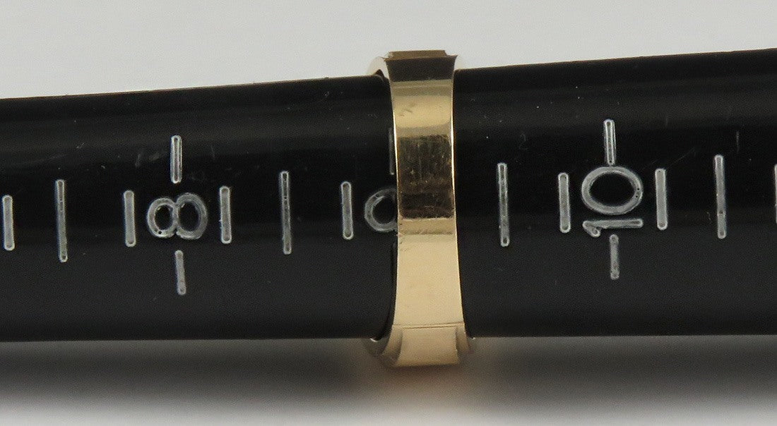 The ring is a size 9. The head of the ring is about 10.5mm wide (north to south), while the band is about 4.2 millimeters wide at the narrowest point.