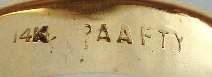 The ring is stamped on the inside of the band with 14K and a maker’s mark. We have tested it with nitric acid and guarantee it to be 14K gold.