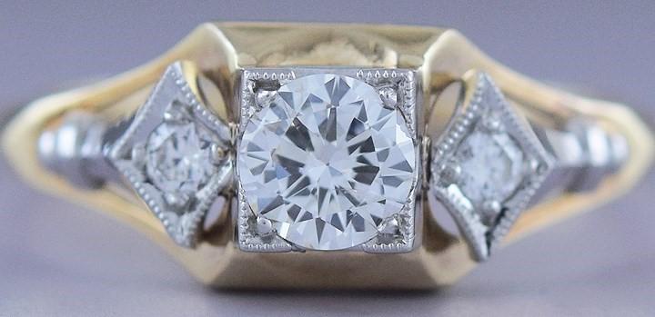 Presented is a beautiful 14 karat gold, platinum and diamond ring. The ring is set with 3 total diamonds, one larger in the center flanked by one smaller on either side. The center diamond is a modern brilliant cut stone of about half a carat in size, of VS-1 clarity and H color. The accent diamonds on either side are vibrant, dazzling stones with a lot of life and fire, totaling another 8 points in weight. The total diamond weight for the ring is about 58 points, or just over a half a carat. The band is done in 14 karat yellow gold, with the diamonds set in platinum with a milgrain finish, so they really pop.