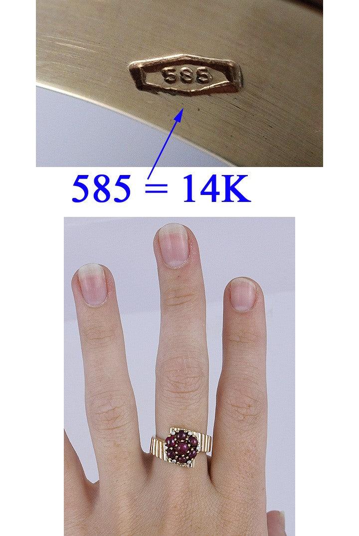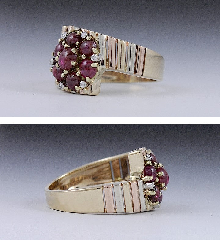 Presented is a fantastic, 14 karat 3-tone gold ring made in America between 1950 and 1970. The thick band is done in an alternating rose, yellow and white gold motif that looks great. The front is prong set with 7 beautifully colored, well-matched cabochon rubies that are surrounded by small accent diamonds. This retro ring is sure to get some attention. The ring is a size 8.