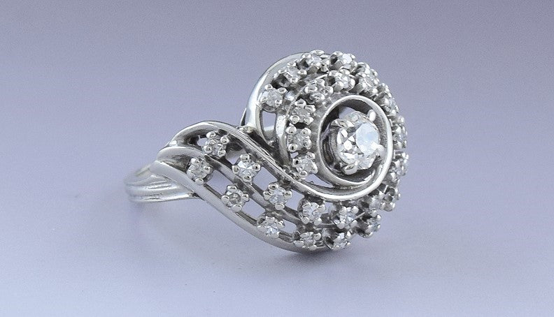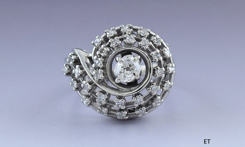 Presented is a stunning 14 karat white gold and diamond ring. This is an American ring, likely from the 1950s-1960s, although the center stone is a much older cut and likely from the late 1800s. The center stone of the ring is a diamond of about 30-33 points in size, in a slightly irregular oval cut. This is a dazzling stone of SI-2 clarity, with a lot of life and fire. Surrounding the center stone are two spirals of single cut diamonds about half a point to one point each in size. The total carat weight is about 48 to 63 points, right around half a carat.