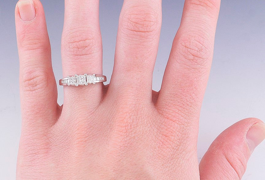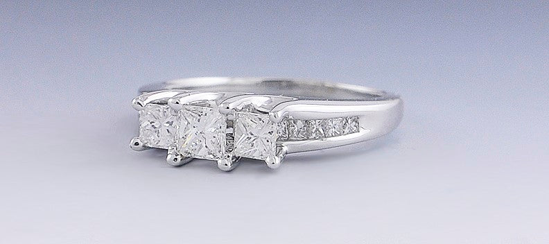 Presented is a gorgeous diamond and 14 karat white gold ring. This is a modern ring, made in America. The ring is prong set with three dazzling princess cut diamonds, with 5 channel set princess cut diamonds on either shoulder. The three central stones are I color and SI clarity, eye clean but with inclusions under loup magnification. The largest center stone is about 30 points, while the diamond on either side is about 16 points. The ten smaller diamonds on the shoulders are about 2 points each. The total diamond weight is 82 points.