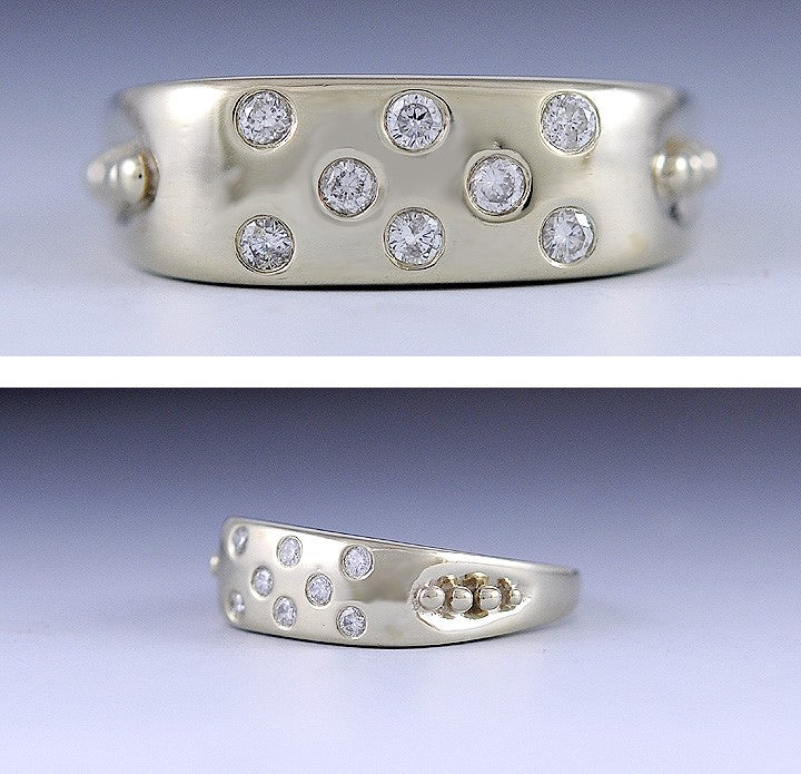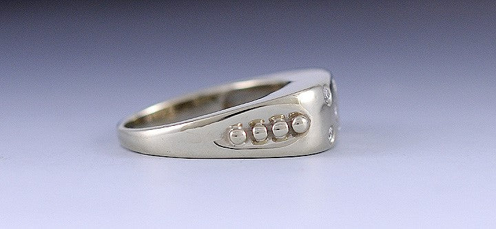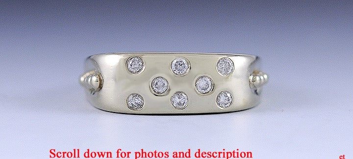 Presented is a unique, 14 karat light yellow gold and diamond ring. This piece is modern and most likely American in origin. The sides have nice gold bead accents. The front portion of the ring is flush or gypsy set with 8 round, brilliant cut diamonds. The diamonds are I quality and H color, there is approximately 1/4 of a carat in total diamond weight in the ring. The ring is a size 8 3/4 and can be resized by a jeweler if need be.