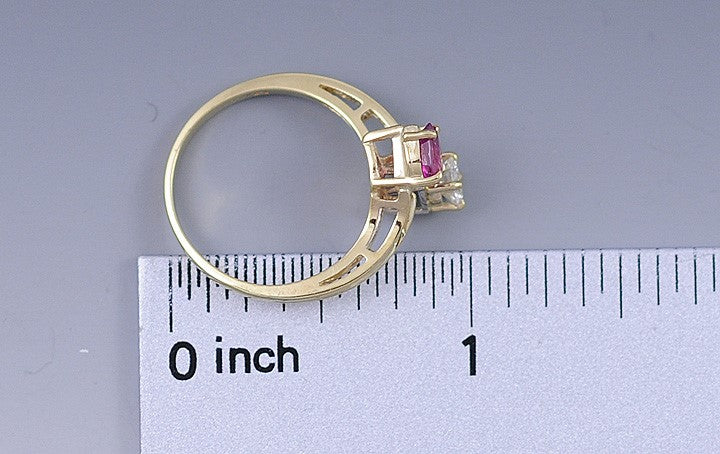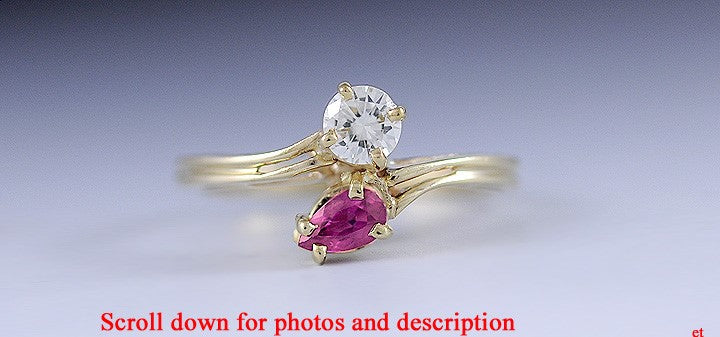 Presented is a beautiful, 14 karat yellow gold ring made during the past 30 years, most likely in America. The band is simple in design and securely prong set in the front of the ring is a ruby and a diamond. The faceted ruby is in a pear shape and is a lovely shade of deep pink. The diamond is fabulous quality and if it didn’t have a tiny chip to it, it would be VVS quality. The chip to the diamond is small and is hard to notice except under a 10X power loop or high magnification. The diamond is G-H color and is approximately 30 points in size.