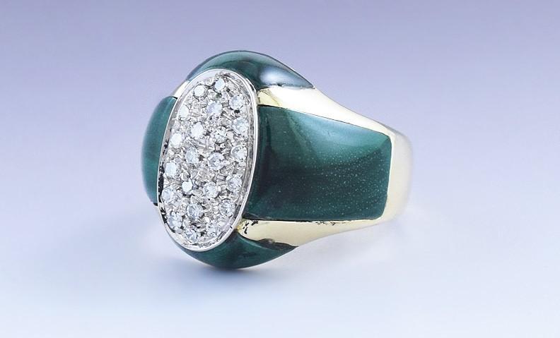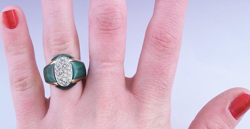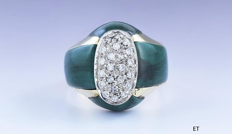 sides of the setting are set with pieces of rich green malachite, contrasting