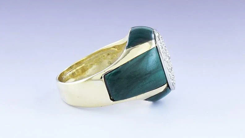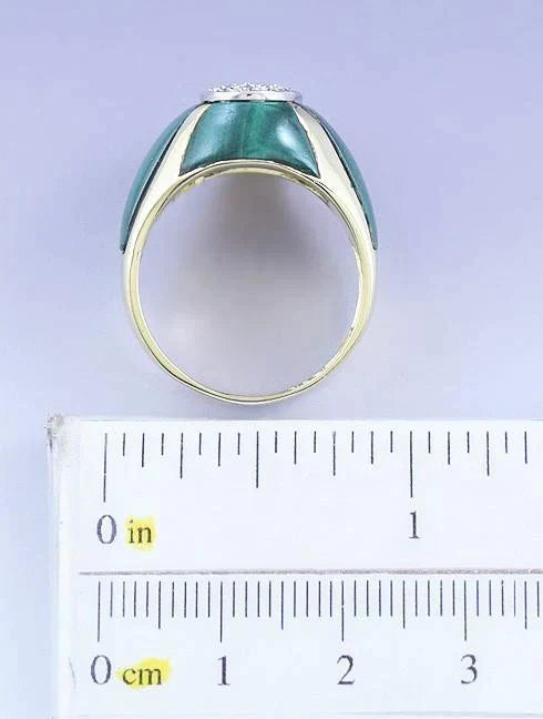 Presented is a fabulous 18 karat gold, diamond and malachite ring. This ring