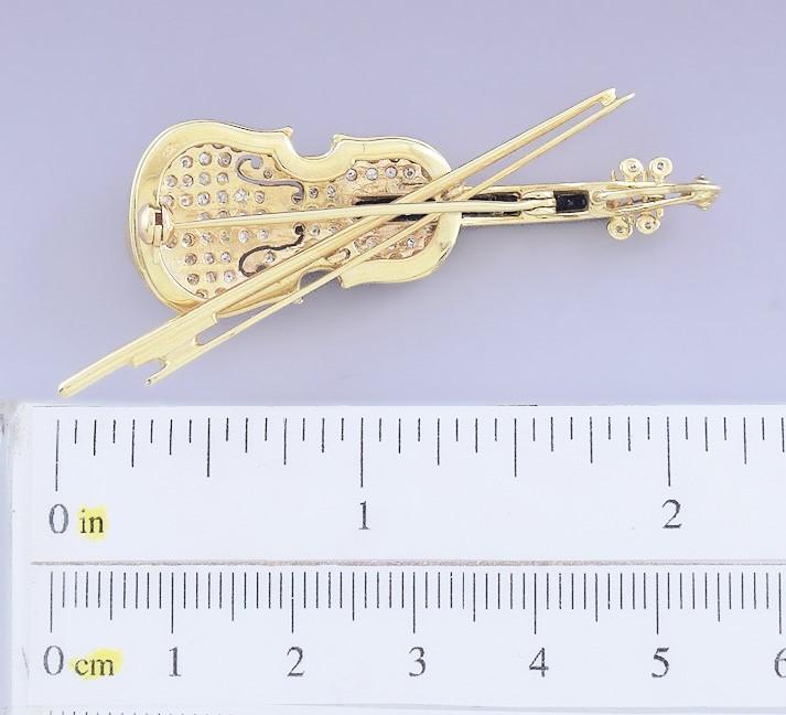 Presented is a stunning 18 karat gold, diamond and sapphire pin or pendant in the shape of a violin. This is a modern piece, possibly of Italian make. The pin is done in a realistic form, very finely detailed, down to the chin-rest, bow, and the strings which are real gold wire. The pin is set throughout the body of the violin with dazzling full cut diamonds, of .5 to 1 point each in size. The tuning keys of the violin each are set with a diamond as well. There are 88 diamonds, total. These are high quality stones, of VS to SI clarity and G color, totaling at least half a carat in diamond weight. Along the neck of the violin are 11 square cut sapphires, real mined-from-the-ground stones with rich blue color. The pin has a rollover style safety clasp, as well as a loop in the back so it can be worn as a pendant. This is an extraordinarily well made piece of jewelry, and would make a great gift for any violinist or lover of classical music.