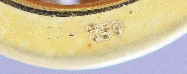 This piece is stamped 750 for 18 karat gold. There may be another mark beside that, but if so it is too worn to be legible. This piece is in great overall condition. The diamonds and sapphires are securely set. The clasp functions well and closes securely. There are no breaks and no repairs. The pin measures about 2 1/4 inches long.