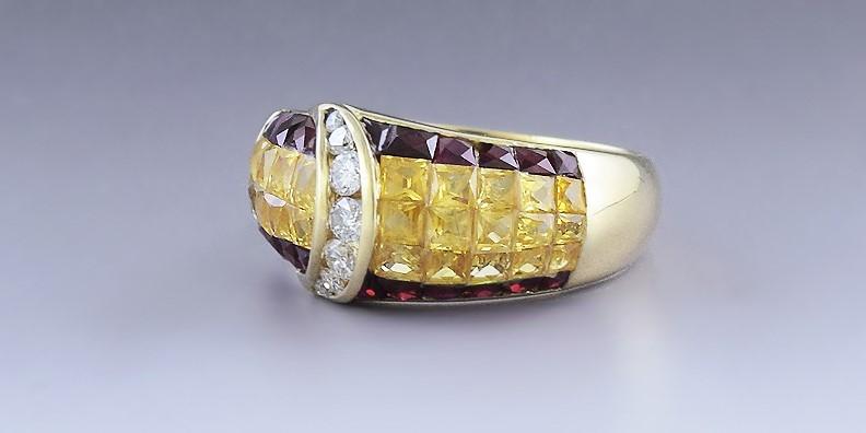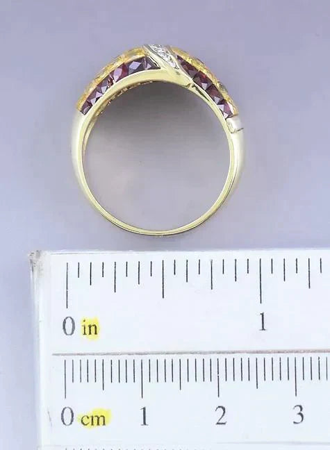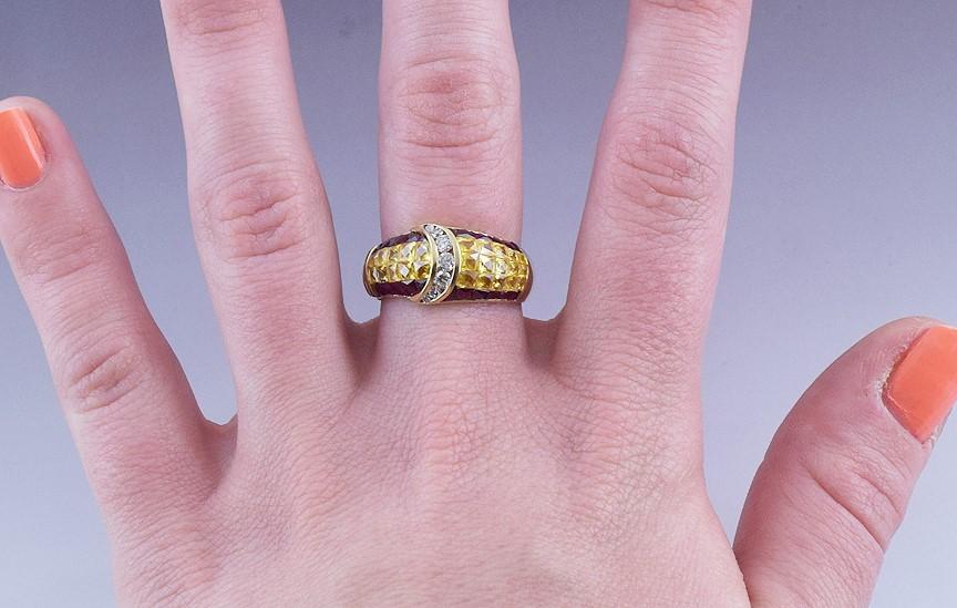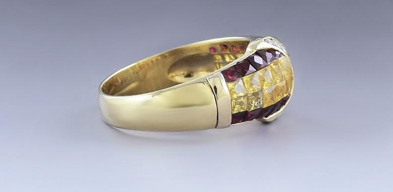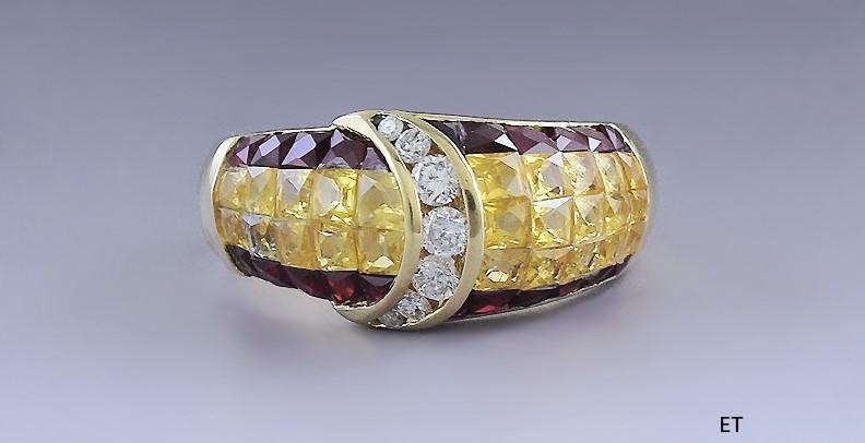 Stunning 18k Gold Ruby Yellow Sapphire & Diamond Crescent Ring