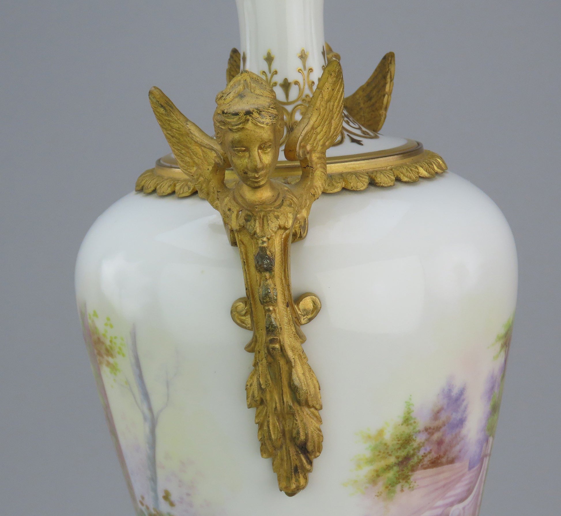 Presented is a fabulous quality antique French porcelain lamp, with ormolu mounts, dating to circa 1900-1910, likely Sevres. The body of the lamp is beautifully hand painted, with a charming scene of a courting couple, the man carving initials in a heart on a tree, on one side, with a scenic landscape on the other side. The neck, foot, and top are finely hand gilt with continuous bands of intricate decoration in two tones of gold, nicely detailed and done in a raised, textured way. The mounts are gilt bronze with very finely done hand engraved detailing, for a very classical look. Most prominent are the three dimensional winged angels on either side, done in a stylized form reminiscent of a ship's figurehead, but very ornate. Given the 'cap' on the top where the lightbulb socket is, and how it matches the rest of the gilt decoration perfectly, this piece was surely made originally as a lamp and is not converted from a vase.