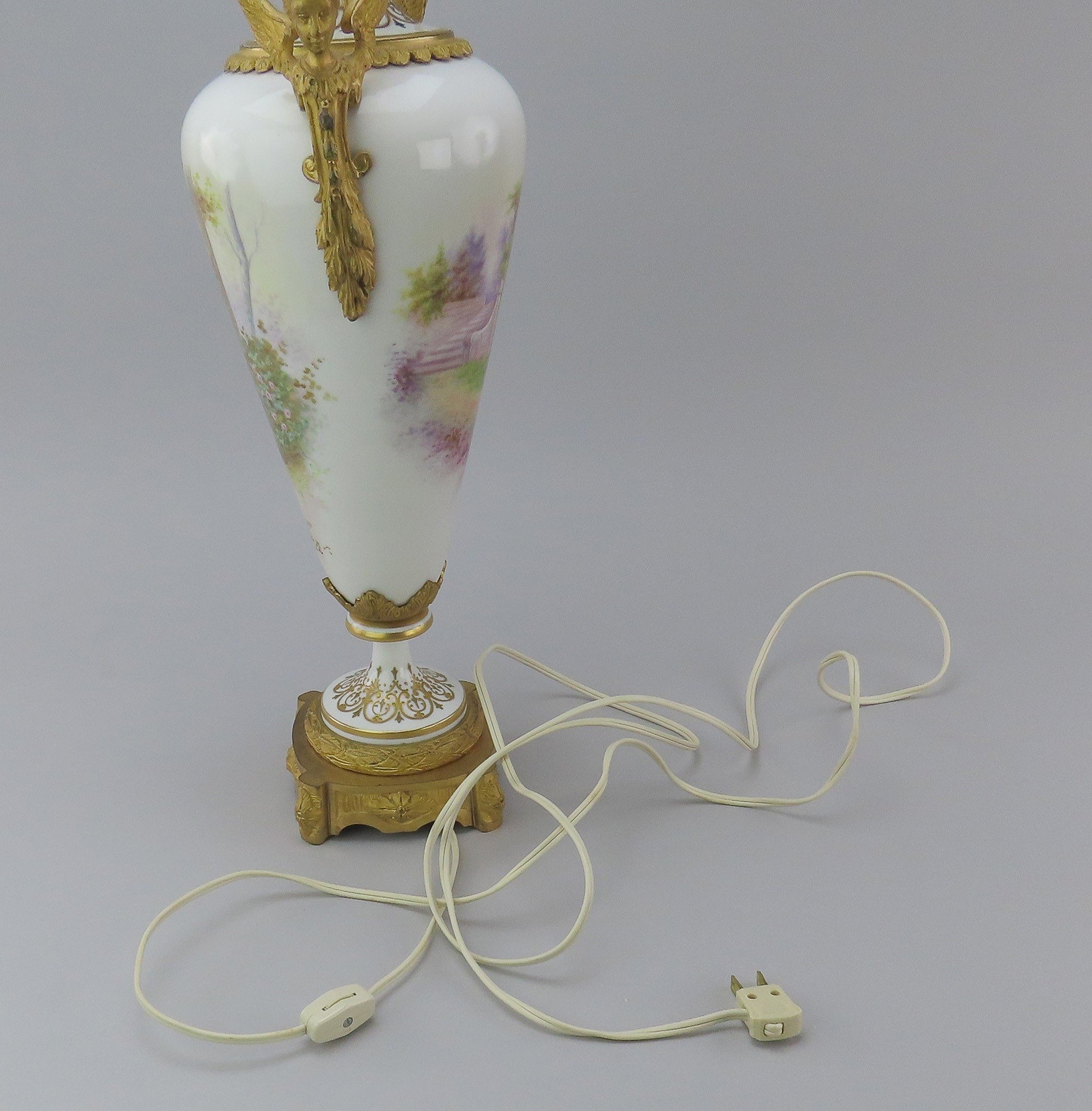 This piece is in excellent condition. The porcelain has no chips, no cracks, no breaks, and no repairs. The gilt bronze mounts are in great shape, though there some minor wear to the gilding here and there, please view the photos carefully and let them guide your judgment. The lamp works, we have plugged it in and tested it with a standard bulb.
