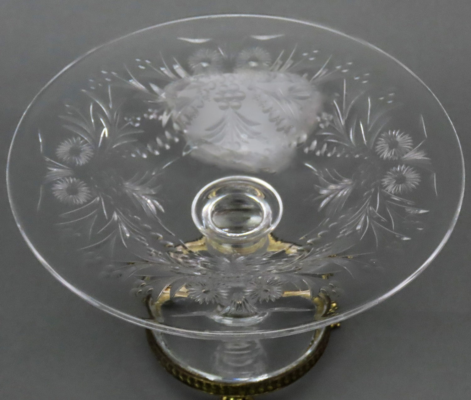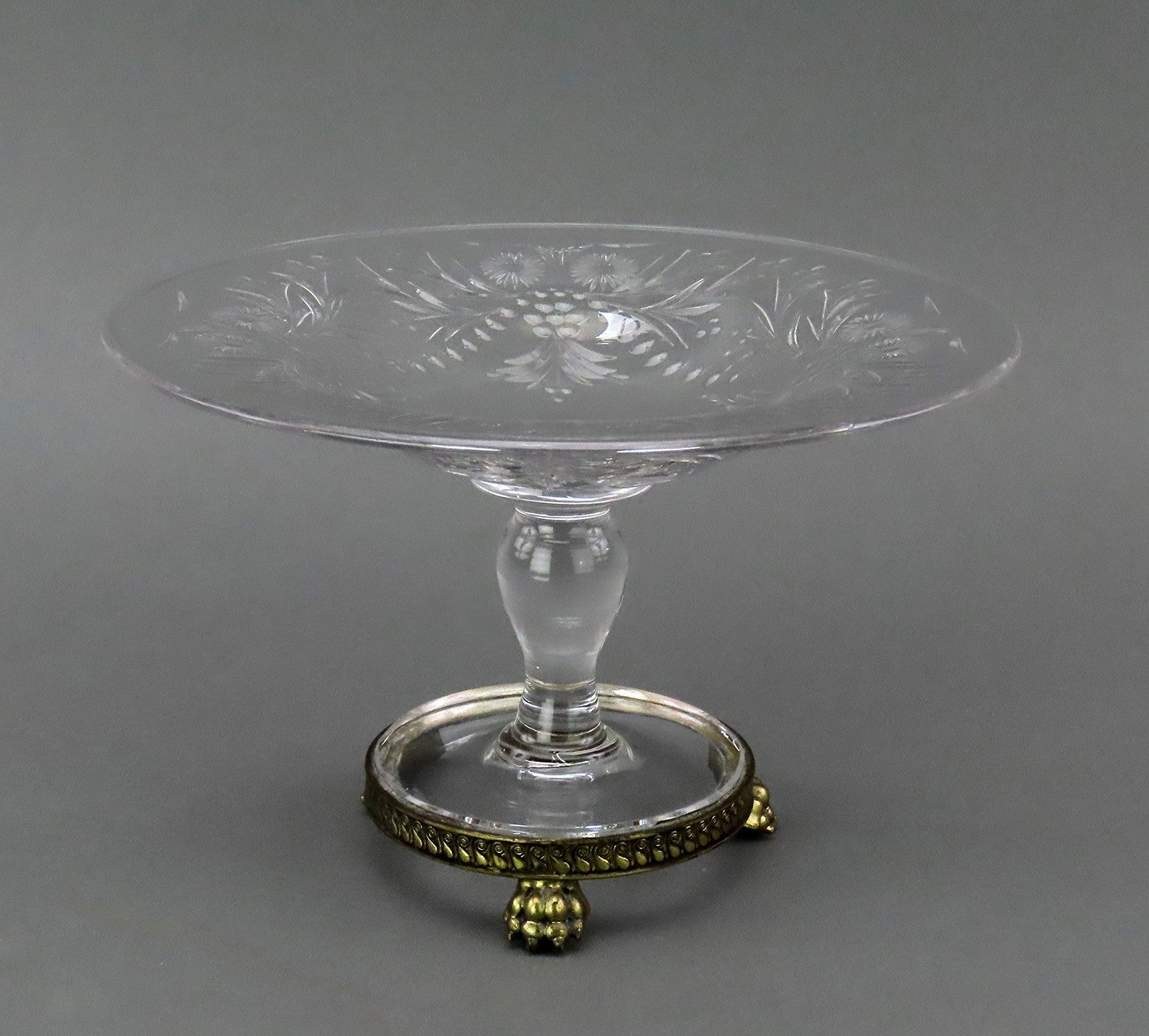 Presented is a stunning glass or crystal Pairpoint tazza/compote from the late-1800s to mid-1900s. This piece has an interesting silver-plated base; however, much of the silver has been worn to show the exposed brass. The glass has been hand-cut on the underside to display gorgeous flowers, berries, and leaves in a circular pattern around the piece. The metal base displays a scroll pattern. The piece stands on three cast and applied animal feet.