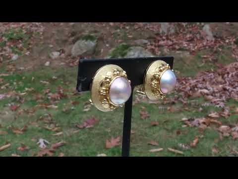 Presented is a gorgeous pair of 18 karat gold and mabe pearl earrings by jewelry designer Paula Crevoshay. Each earring is set with a stunning mabe pearl measuring about 12.3 millimeters in diameter. The pearls have almost a rose gold look to them, with beautiful lustre and orient, seeming almost to glow with pink and blue highlights. These pearls are exceptional quality, as you'd expect from a designer with Paula Crevoshay's stated commitment to integrity and artistic vision. These earrings are made in an antiquities inspired style, with applied granulated decoration against gold with a rich textured finish, reminiscent of Etruscan Revival pieces. The earrings have omega style backs with posts for wear with pierced ears.