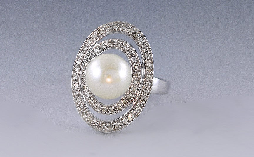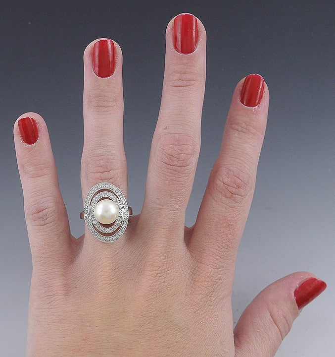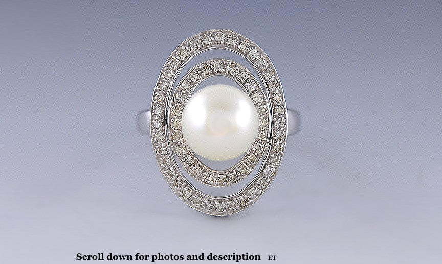 Presented is a lovely pearl and diamond ring in 14 karat white gold. This is a modern piece, likely of American make. The ring is done in the form of two concentric ovals with a pearl of about 9.2mm set in the center. The pearl is very nice quality, with great lustre. We believe it is cultured. There are 60 diamonds set in the rings around the pearl, of about 1 point each, of I/J color and mostly of SI clarity.