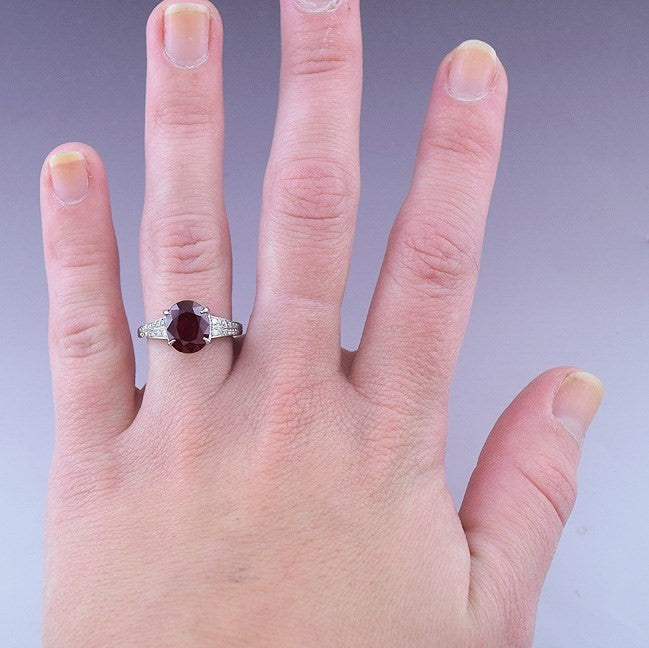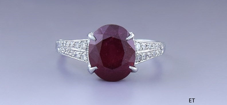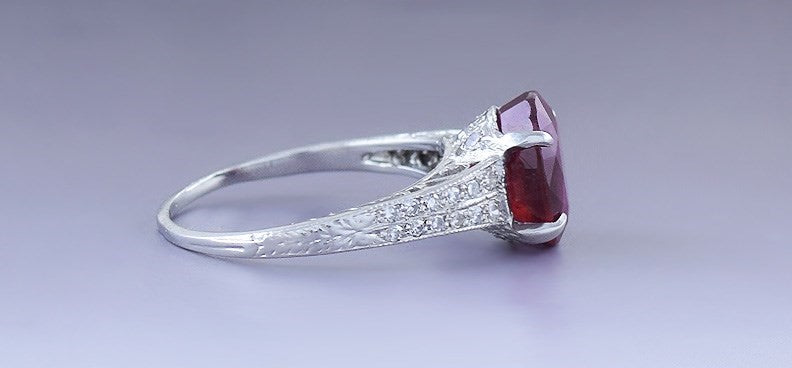 This piece is in excellent overall condition. We think this ruby might be glass filled, but it is difficult to tell. The color is great, and it has inclusions that are only noticeable when you are viewing the stone under magnification. This ring has a great look at a very good price. The workmanship on the band is lovely.