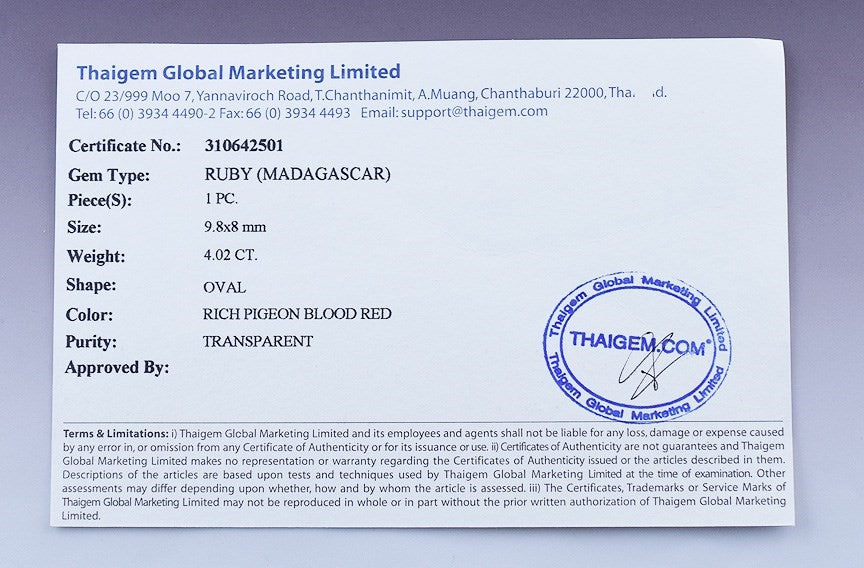 Presented is a very high quality, platinum, diamond and ruby ring in a size 8. This modern piece has a high quality platinum filigree mounting that is set with 30 diamonds in total. The diamonds are nice quality stones, SI-VS clarity and H color. The center is set with a pigeon blood red ruby. The ruby is a great size and measures 9.8mm X 8mm and is 4.02 carats. Included with this ring is a certificate of authenticity from Thai Gem. The ring is a size 8 and we
