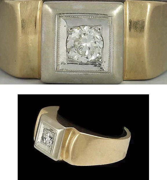 Presented is a fine quality, heavy weight 14K gold and diamond ring. The ring is topped with a modern round brilliant cut diamond at the center, probably set in platinum. The diamond measures approximately 4.5 millimeters in diameter at the top, perhaps a little larger. We estimate the carat weight of the stone to be about 38-43 points or around 0.4 carats. The diamond has G-H color and VS clarity, most likely VS2. The diamond is securely mounted in a heavy yellow gold setting with a simple smooth finish design. The ring is fairly modern.