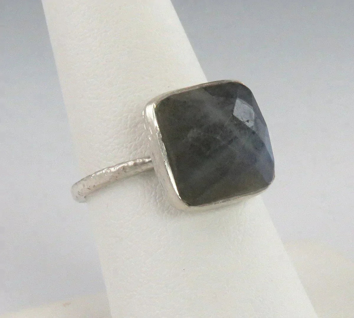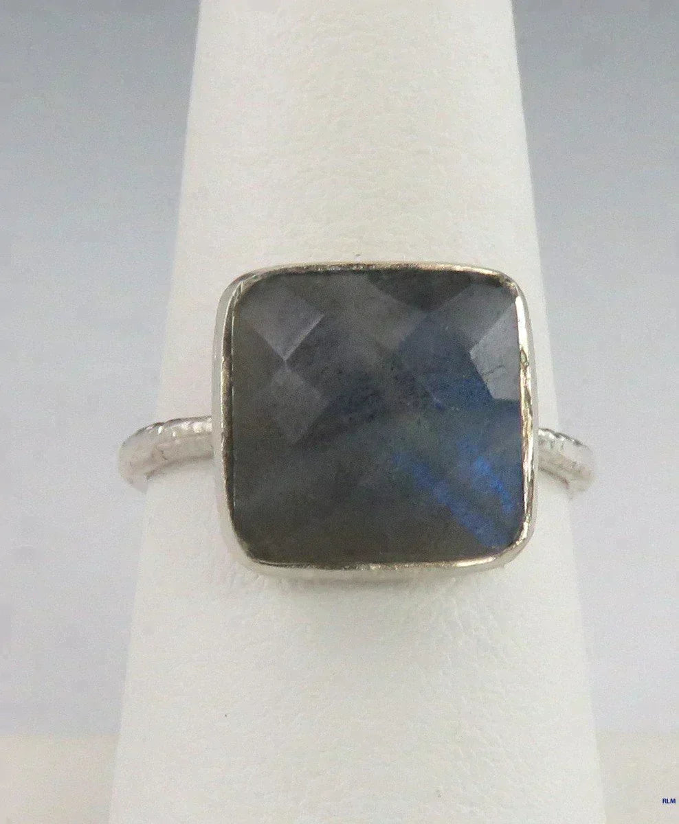 Behold the Labradorescence! Presented is a very original and eye-catching silver and Labradorite ring. The stone is a huge geodesic dome of mystery, appearing at first glance like a window into a deep frozen pond, until you move and its facets throw off the most incredible flashes of brilliantly clear bright sky blue light! The rest of this ring is equally impressive and beautiful. The artist set the stone onto a thin square base with a very fine narrow band around your finger. The silver has a fantastic texture, evoking crusty ice or thin silvery driftwood!