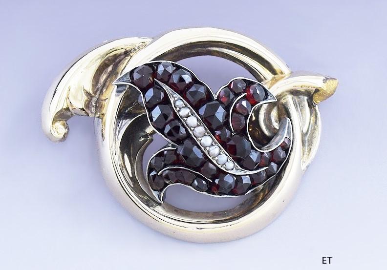 Presented is a lovely Victorian 14 karat gold, garnet and seed pearl pin or brooch. This piece dates to around 1850-1880 and is likely American or Bohemian. The pin is done in the form of a flower inside a stylized circular leaf and stem. The flower is set with rich red garnets, with a central stripe of real, natural seed pearls. The back of the pin has an old C style clasp. Next to the clasp is a little loop, likely where a safety chain was at one time attached or where a bail could be added.