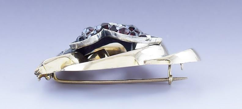 The pin is in great overall condition. The garnets and seed pearls are all intact. The clasp looks like it has been reinforced with a strip of gold under the 'C' portion, with a solder repair or reinforcement by the hinge. The solder extends to the front of the pin on the stem portion, but the lead solder has been camouflaged with gold paint. Otherwise there are no repairs.