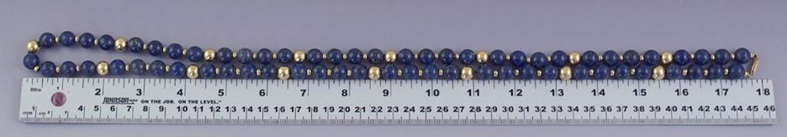 Presented is a stunning vintage lapis lazuli and 14 karat yellow gold bead necklace. The necklace consists of round beads of lapis lazuli about 10 millimeters in diameter, interspersed with 14 karat yellow gold beads of about 9 millimeters in diameter and smaller 14 karat gold rondelles. There are 15 of the larger gold beads and 48 of the smaller, so although most of the necklace's weight is in the stone there is a considerable amount of gold here. The lapis lazuli is exceptionally nice, a very rich dark blue full of speckles of gold. The necklace is quite a long length and can easily be worn doubled or at its full opera length. The necklace has a secure plunge style clasp done in 14 karat gold filigree.