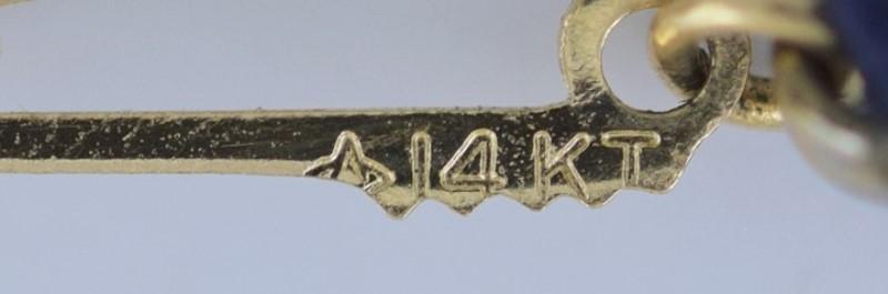 This piece is stamped 14k on the tab of the clasp. We have tested the beads with nitric acid and guarantee them to be 14 karat gold as well.