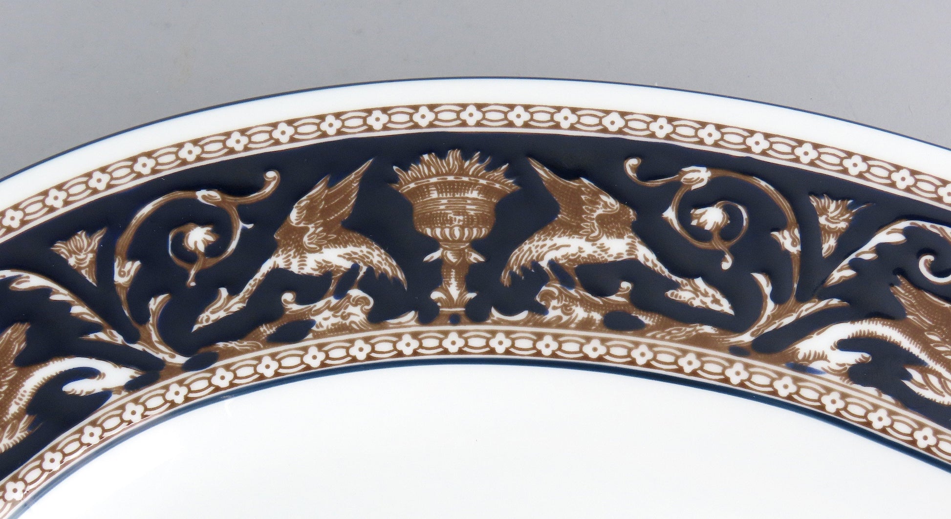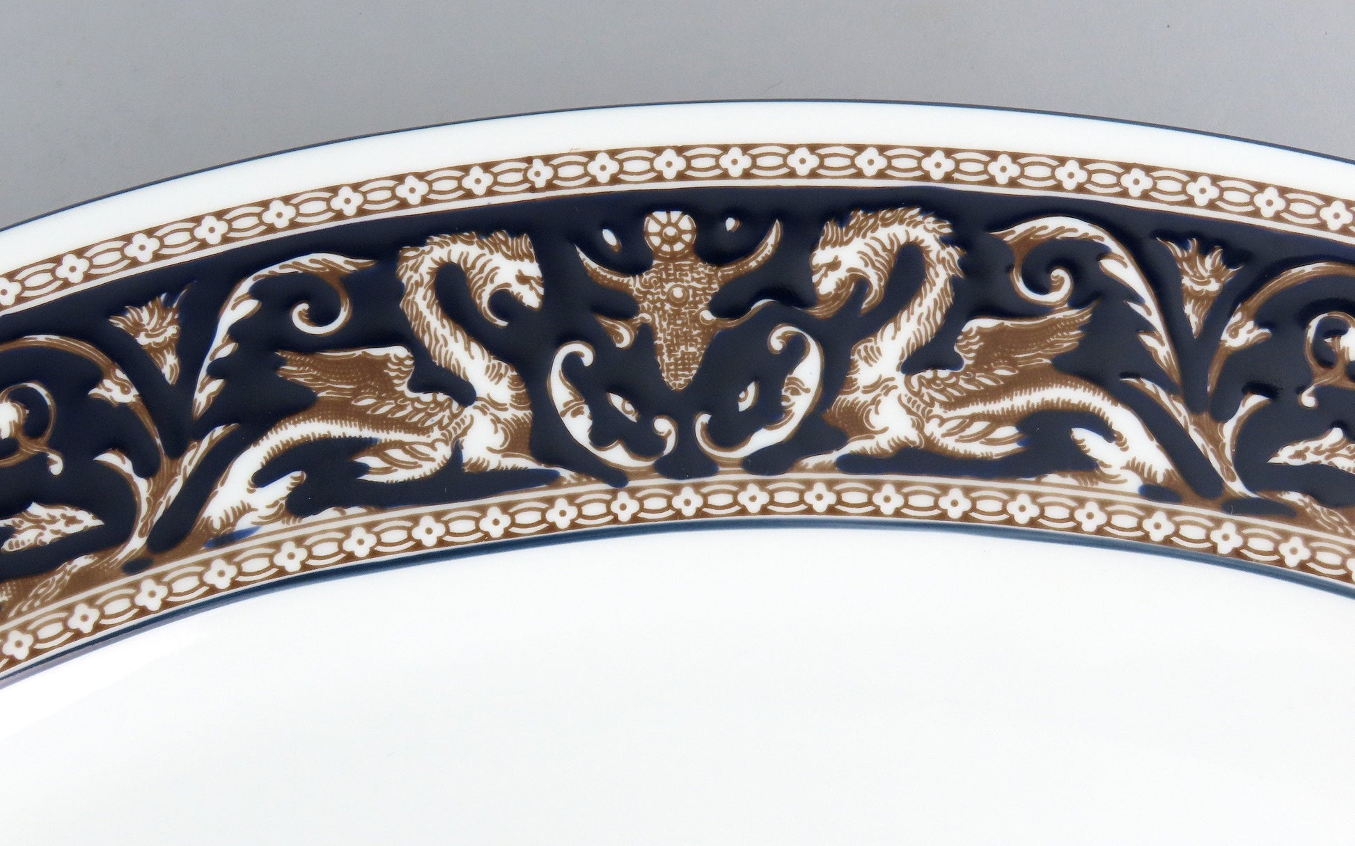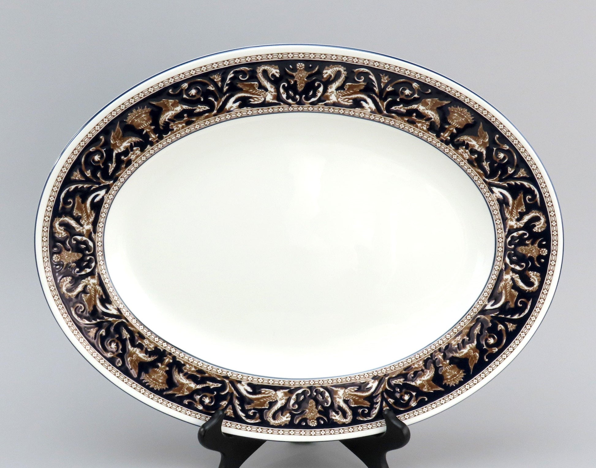 Presented is a stunning bone china large platter from Wedgwood. This piece is in the Florentine pattern, which was produced in the mid-20th century. The pattern displays fancy scrolls and dragons in a border around the piece. This version of Florentine shows an elegant dark navy blue background and trim.