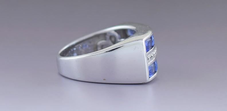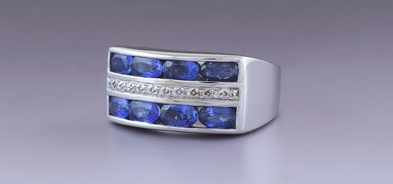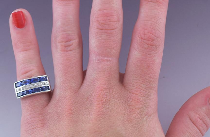 Between the two rows of sapphires are 11 diamonds, about one point each in size.