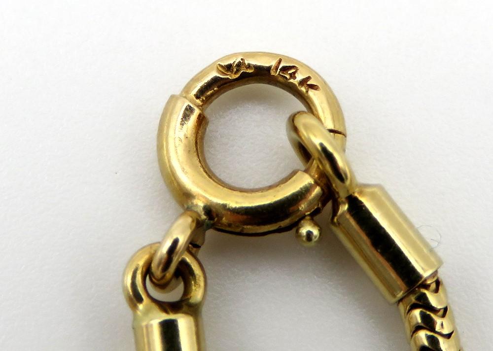 This piece is stamped 14k on the clasp. All parts are 14 karat gold, nitric acid tested and guaranteed.