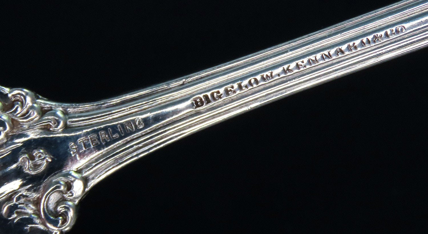 The reverse is marked sterling along with the maker's mark for Durgin. There is also a retailer's mark for Bigelow, Kennard & Co.