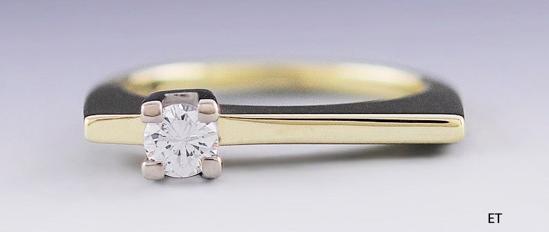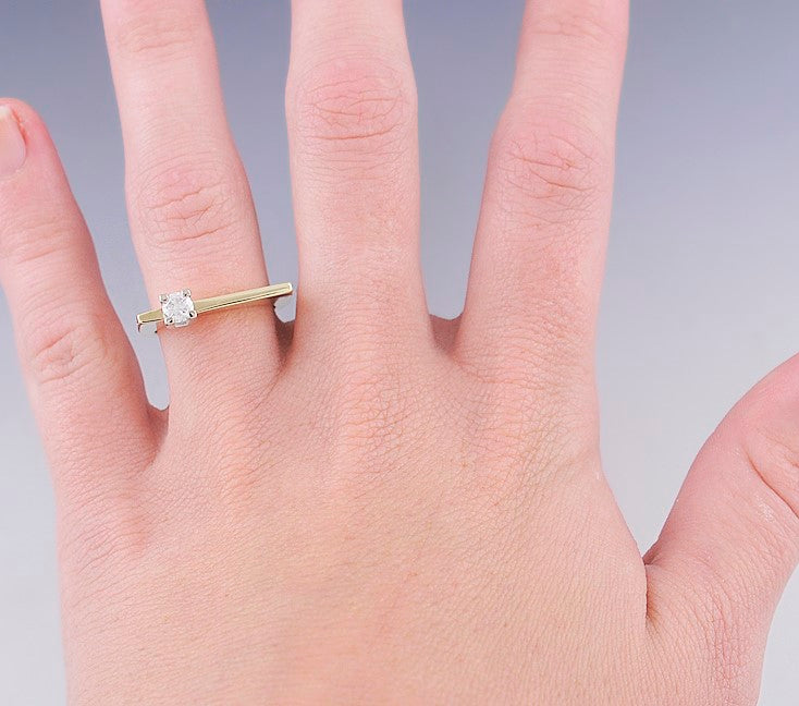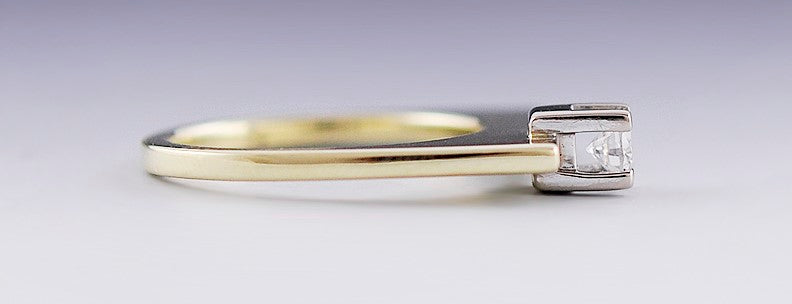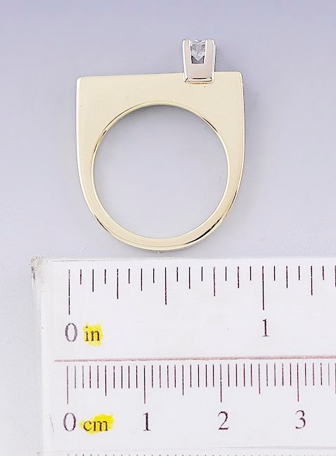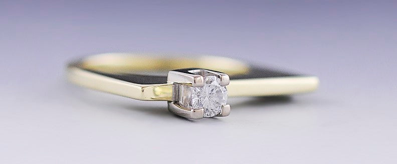Presented is a stylish modernist ring in 14 karat gold and diamond. This piece was likely made in America in the past 30 years. The ring has an interesting off-set design, prong set with a single modern brilliant cut diamond. This dazzling stone is about 25 points in size, of SI-2 clarity and G color. Although the diamond has an inclusion near the center, this can't be seen without magnification and close inspection, the stone is eye clean. The gold setting is sleek and modern, and the ring is very flattering on the hand.