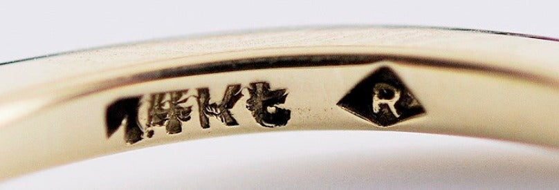 The band is stamped and guaranteed 14k and has a maker's mark of R.
