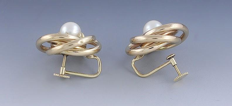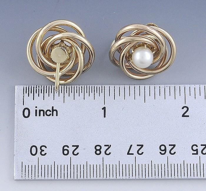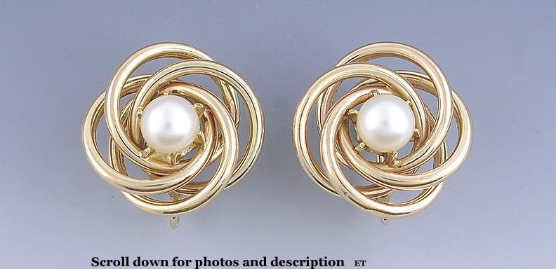 Stylish Retro Pearl & 14K Yellow Gold Spiral Knot Earrings c1950s-60s