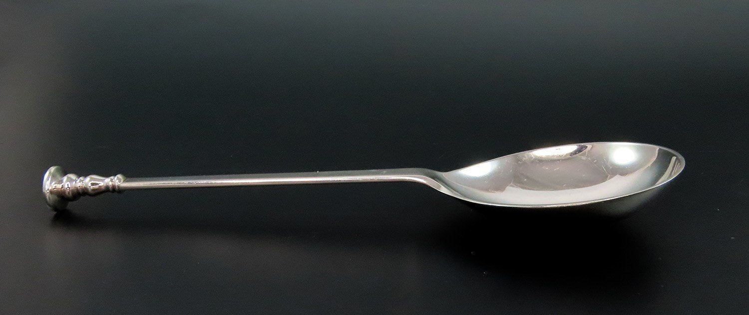 Presented is an stylish sterling silver small serving spoon from the early to mid-1900s. This piece displays a round bowl and interesting ribbed flat top. This spoon is a copy of a much earlier style, circa 1500 to 1650.