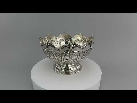 Presented is a wonderful English Georgian sterling silver bowl, dated 1778 and made by Thomas Heming. The bowl is beautifully chased with classical scroll and bellflower decoration around the sides, and has an undulating rim decorated with figurehead style masks at the highest points. The bowl stands on a low round pedestal style base, which is likewise hand chased with scroll and foliate decoration. The overall look is almost that of a Monteith bowl, though it does not have ring handles and is on the smaller side for a punch bowl. Very well suited for a fruit or centerpiece bowl.
