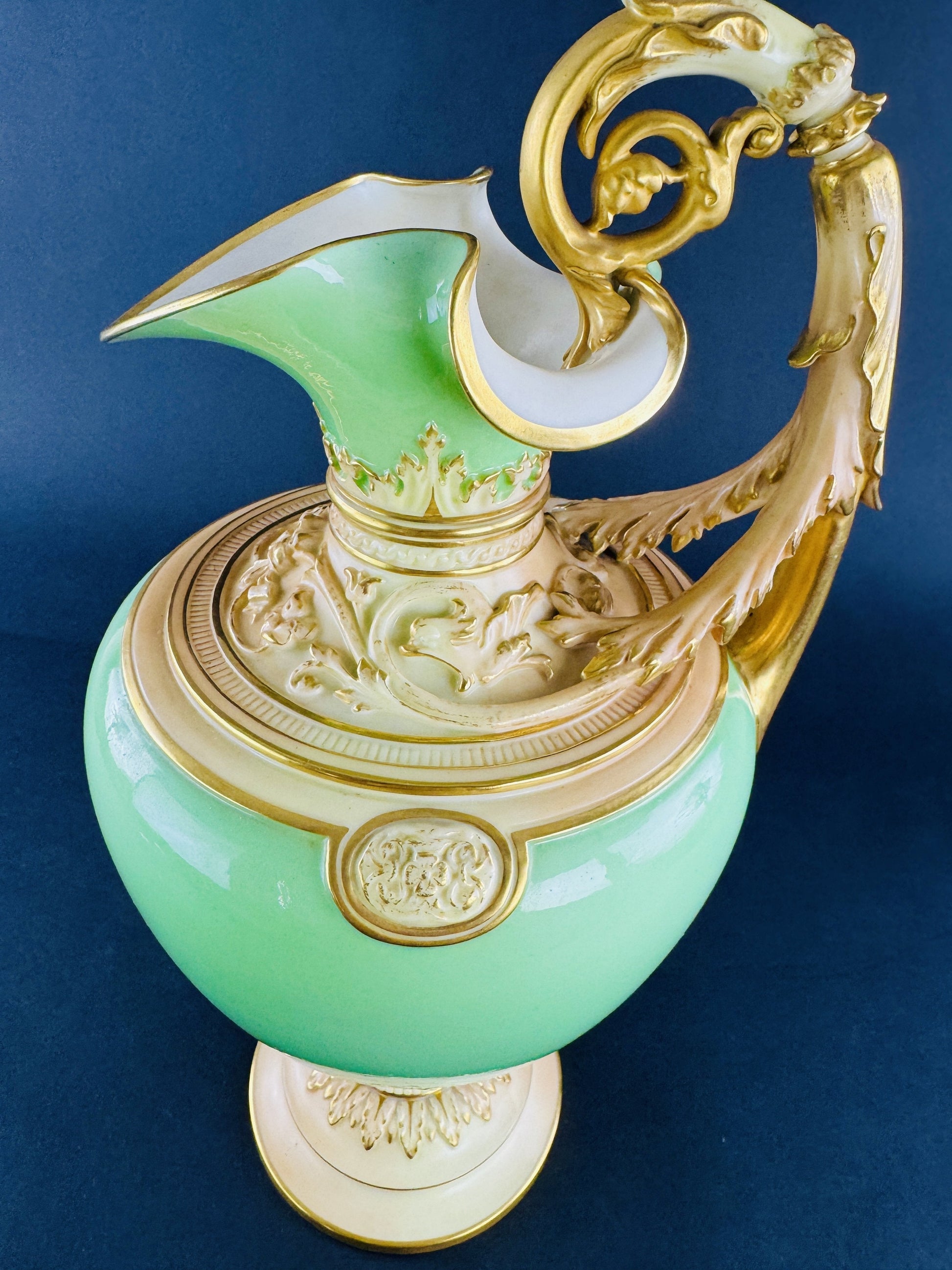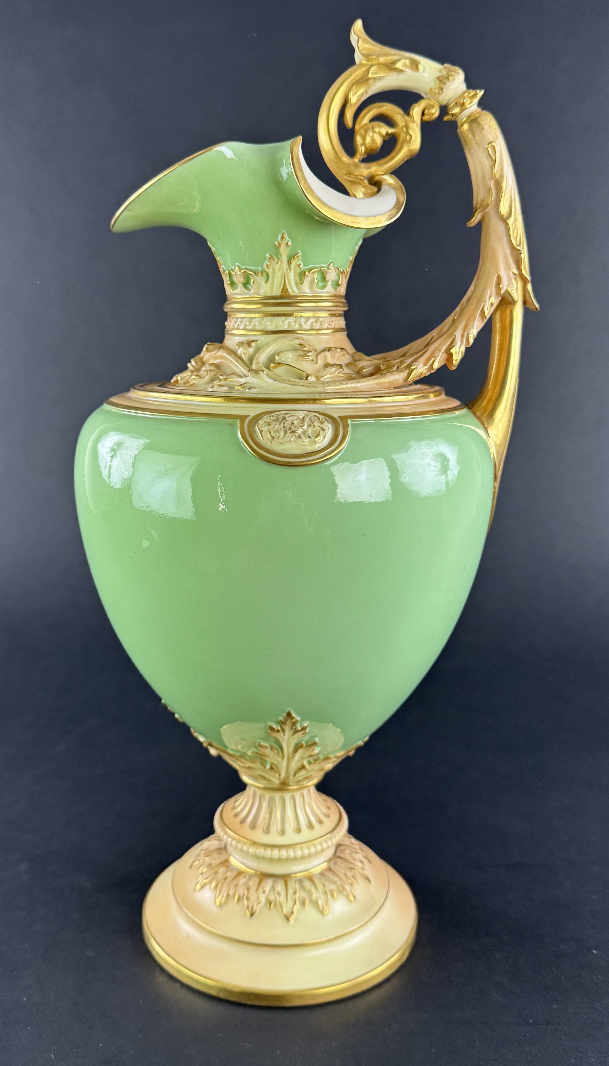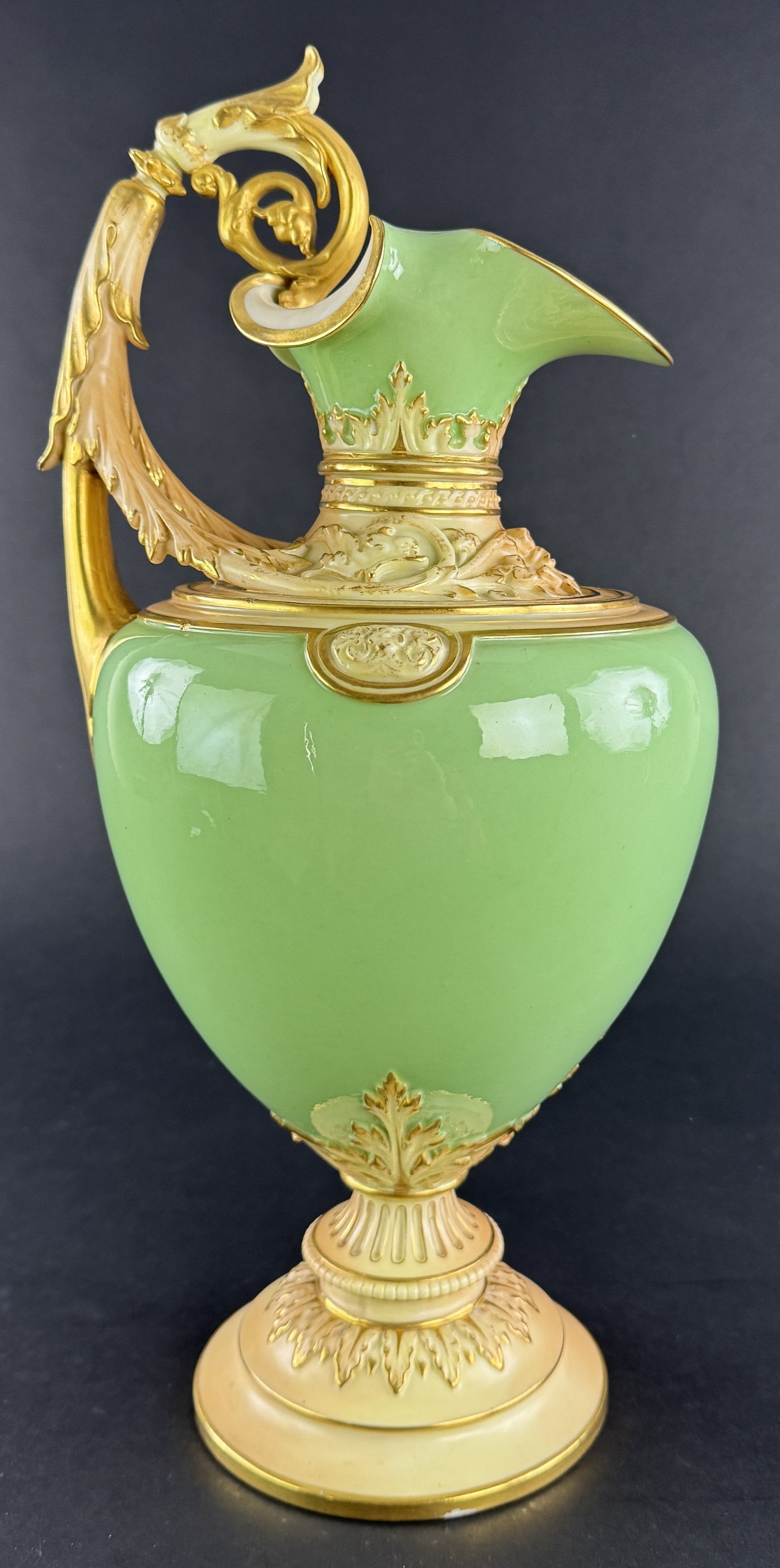 Presented is a fantastic quality green and gold ewer or pitcher by Royal Worcester, dated 1894. The ewer is an impressive large size, with a vibrant green body and ornately decorated handle, collar, and foot. The green color is a lovely apple green, most accurately shown in the second photograph, though color will vary from monitor to monitor/device screen and with different lighting of course. The shoulder and collar as well as the handle and foot are done in a cream/buff coloration, with fine gold gilt detailing picking out the intricate scrollwork and foliate decoration. The piece is very impressive and eye-catching, and would make a great addition to any home's décor.