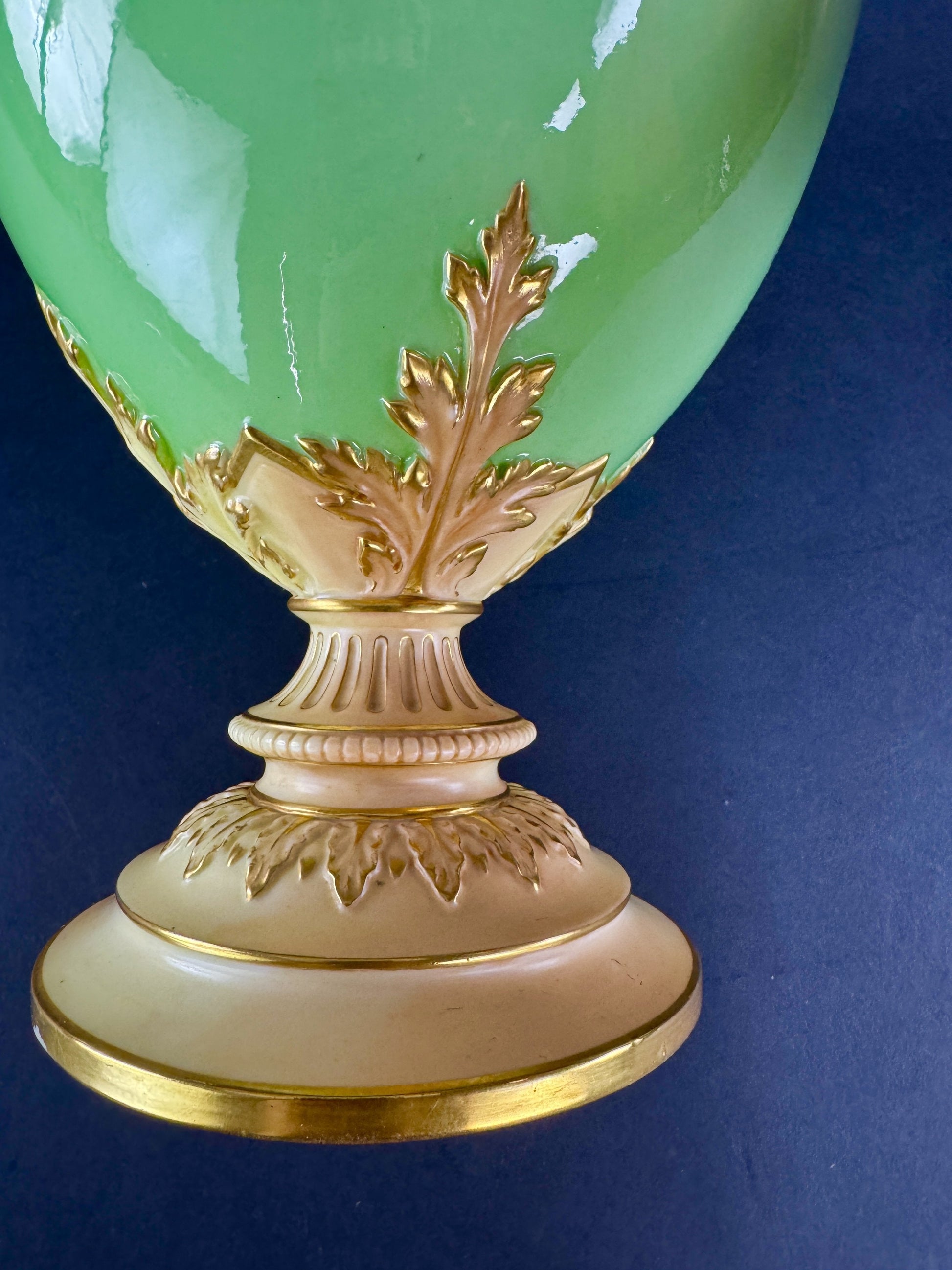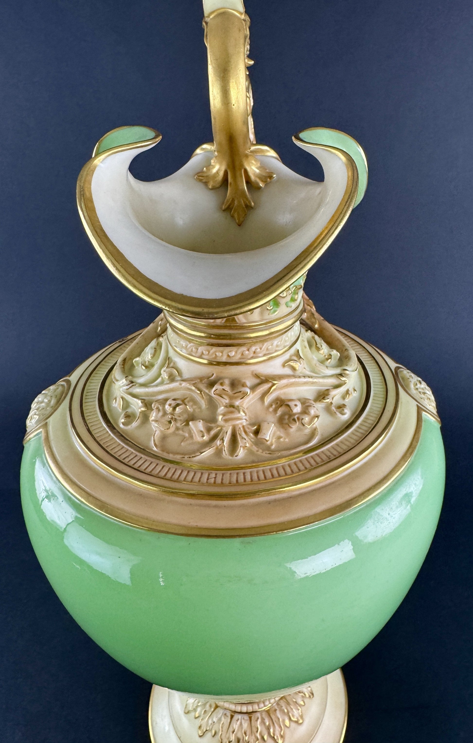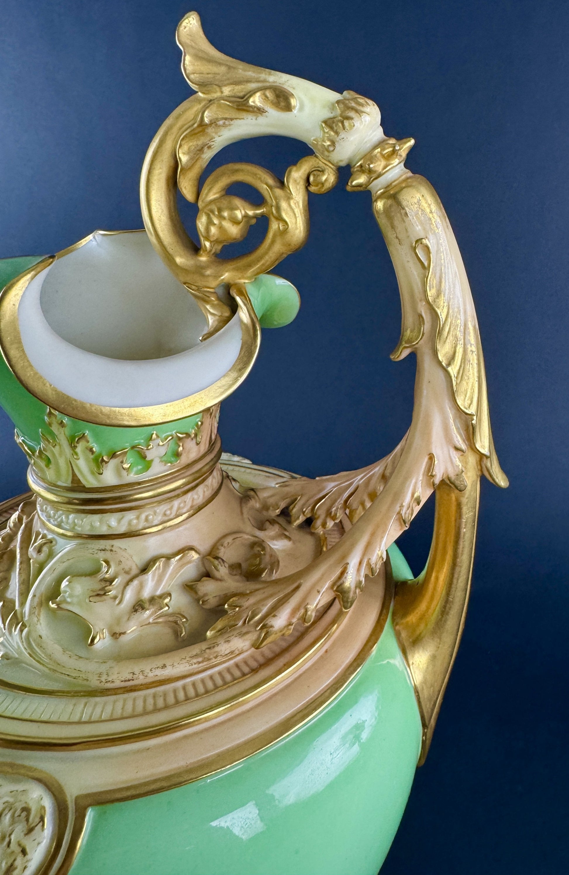 Presented is a fantastic quality green and gold ewer or pitcher by Royal Worcester, dated 1894. The ewer is an impressive large size, with a vibrant green body and ornately decorated handle, collar, and foot. The green color is a lovely apple green, most accurately shown in the second photograph, though color will vary from monitor to monitor/device screen and with different lighting of course. The shoulder and collar as well as the handle and foot are done in a cream/buff coloration, with fine gold gilt detailing picking out the intricate scrollwork and foliate decoration. The piece is very impressive and eye-catching, and would make a great addition to any home's décor.