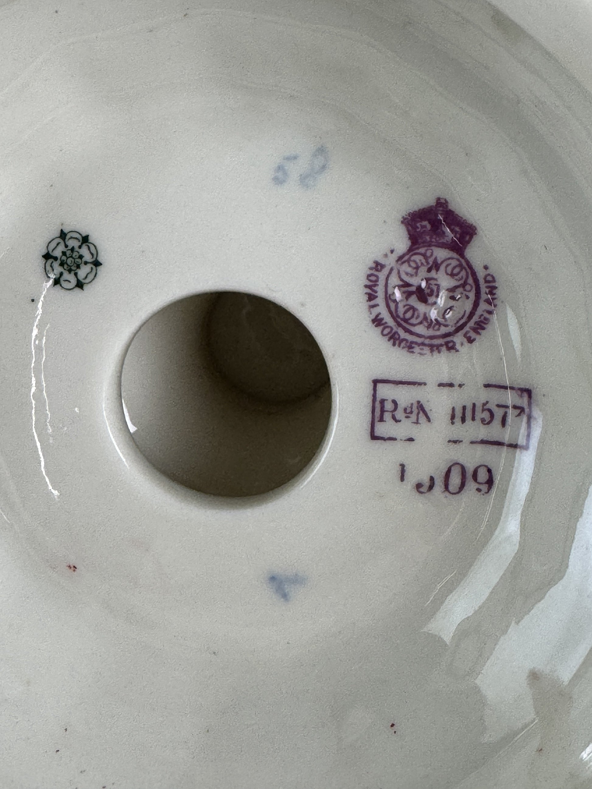 The underside is marked with the Royal Worcester mark, dated 1894, as well as an English registry mark, a number 58 in underglaze blue, and a green Tudor rose mark, likely an indication of a royal commission or warrant.