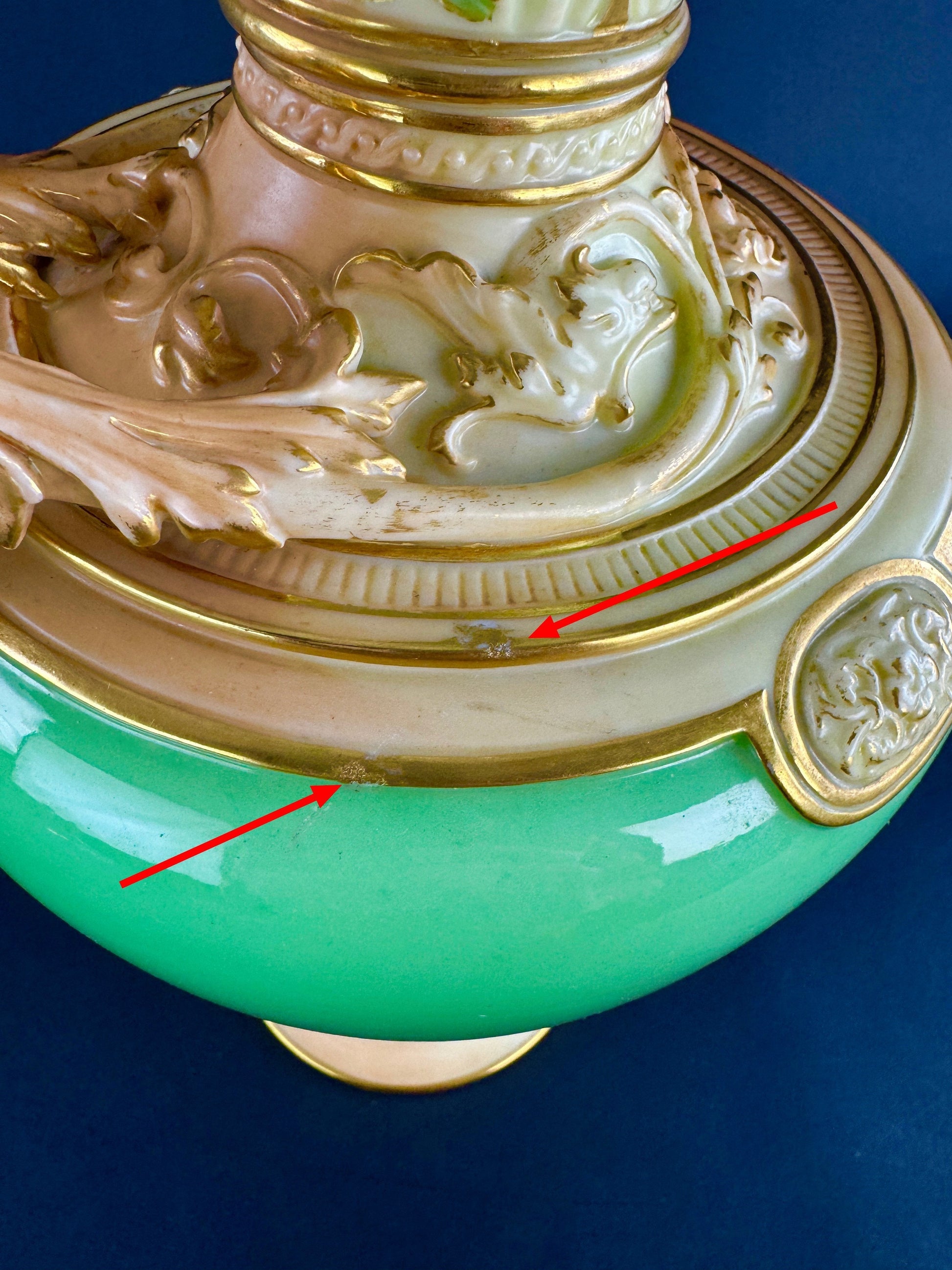 This piece is in great overall condition. There are two tiny chips that have been re-gilded, pointed out in the eighth photograph. There is some minor wear to the gilding here and there, but nothing significant or noticeable without close, careful inspection. There are no other chips, no cracks, no breaks, and no repairs.