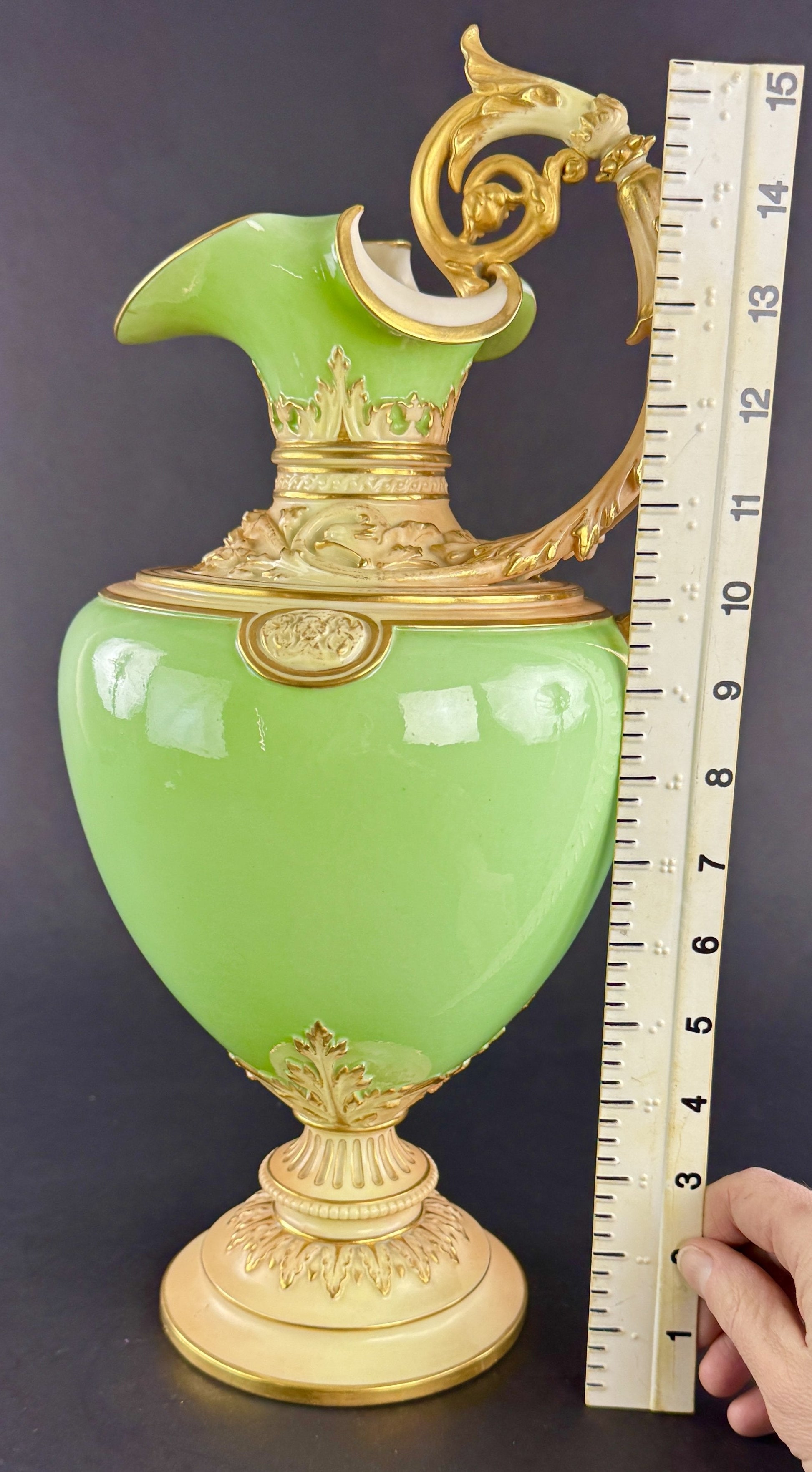 Superb 1894 Royal Worcester Green Gold 16" Ewer Pitcher Vase Tudor Rose Mark