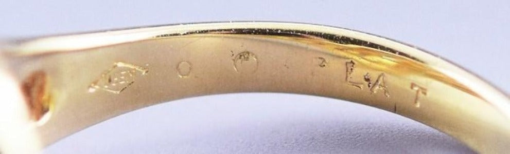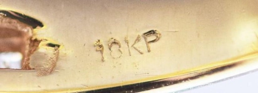 The band is stamped 18kp for 18 karat plumb, meaning exact, as well as plat