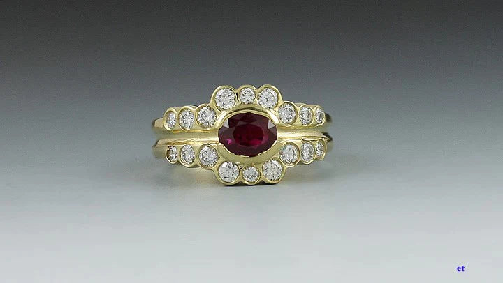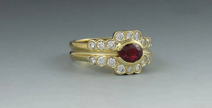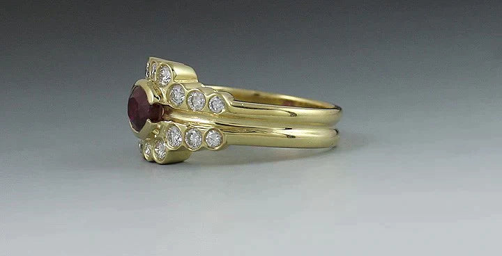 Superb 18K Yellow Gold 1ct Red Ruby 2/3ct Brilliant Diamond Band Ring Size 5.75