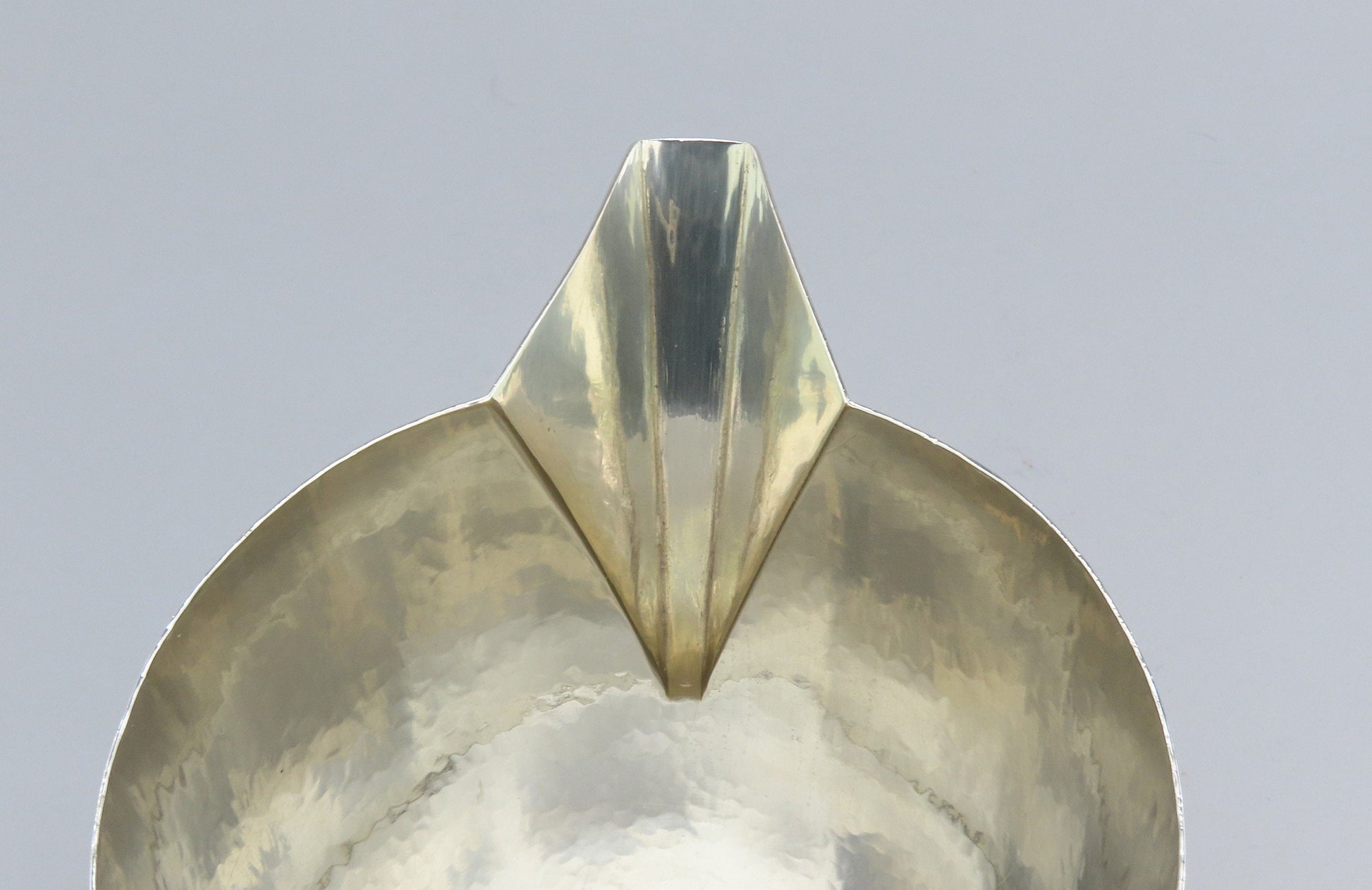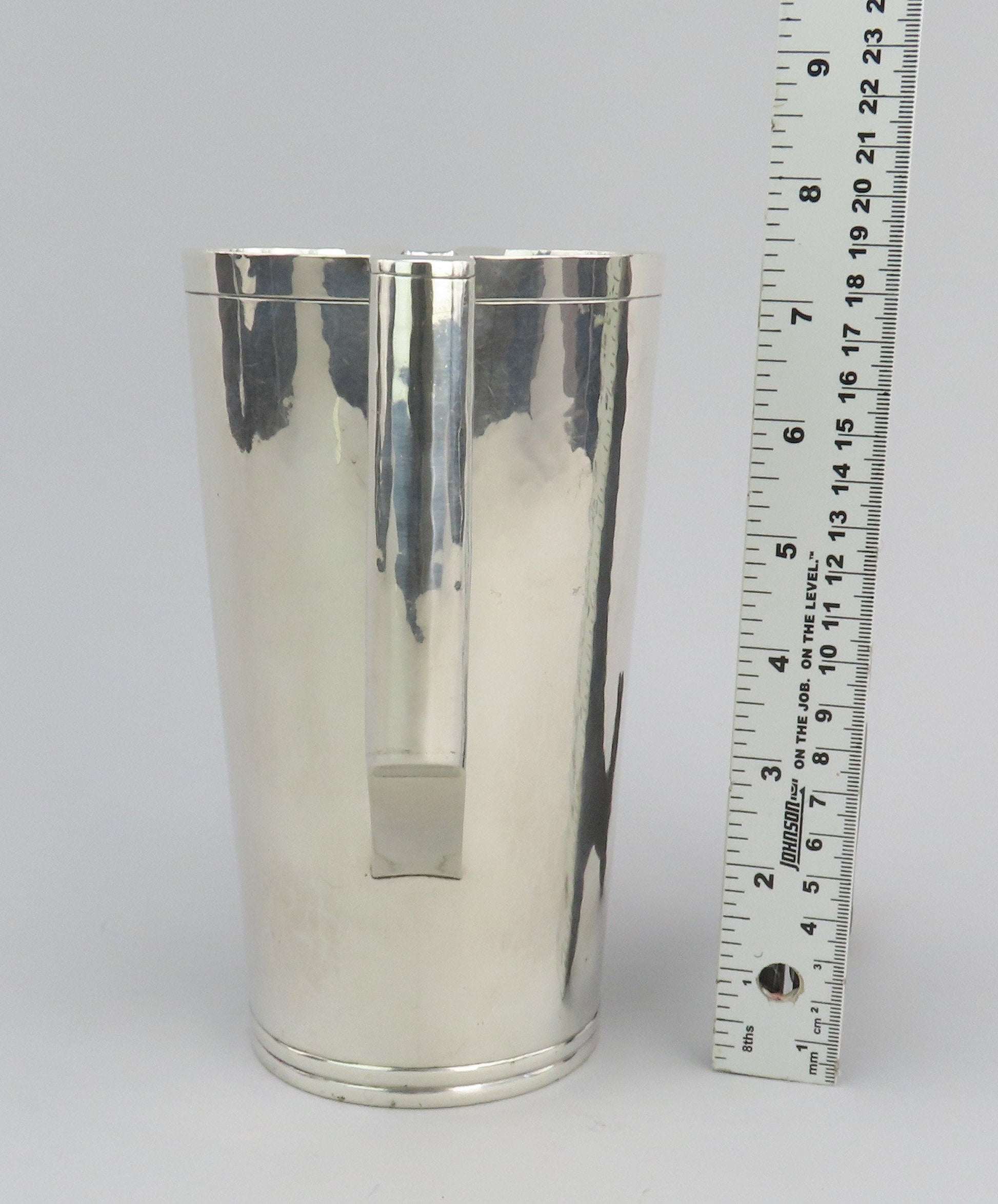 Presented is a beautiful vintage or antique German 800 purity silver pitcher, dating to around the 1920s-1950s. The pitcher is made in a very stylish tapered cylindrical form, with a fine hand hammered finish. The handle is done in a particularly striking way, with a cylindrical upright, very easy to grip. The spout has a kind of geometrical design, with a squared off tip. The pitcher has a liquid capacity of about 4 cups, or 32 fluid ounces/950 milliliters when filled to about the bottom of the spout, though it can be filled as much as 5 cups safely. Very elegant piece.
