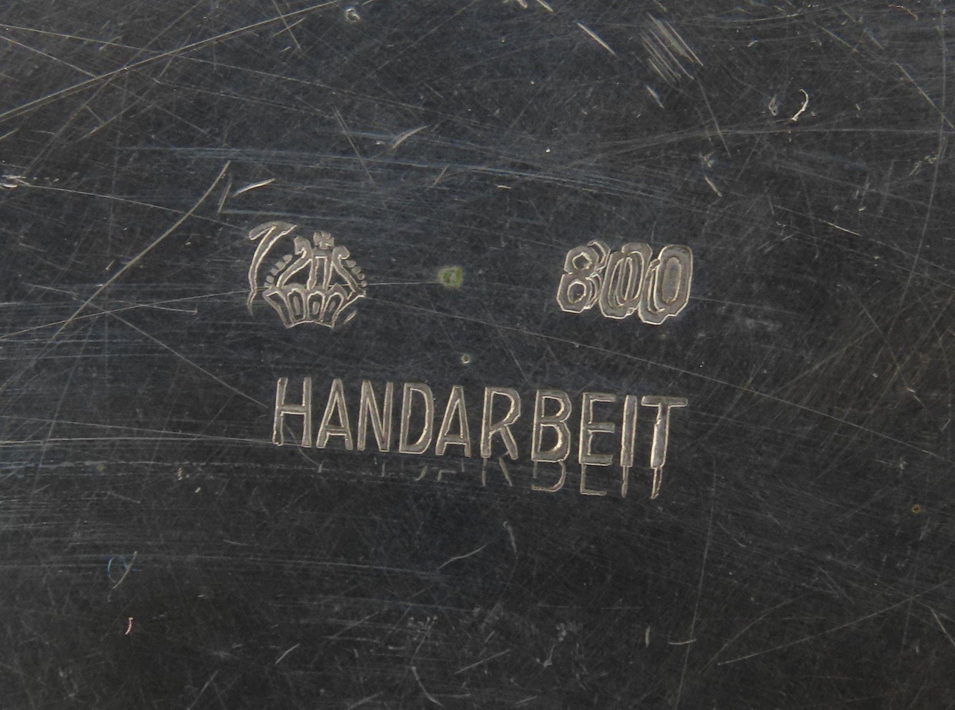The underside is stamped with the German crescent moon and crown as well as 800 for the purity of the silver and 'Handarbeit' for hand-work or hand-wrought.