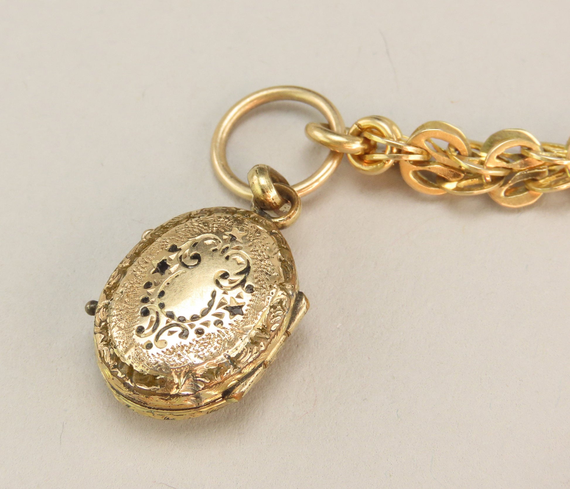 We have tested all parts with nitric acid and guarantee that the chain is solid 14 karat gold. The locket is primarily gold-filled, however the front and back panels are 10 karat gold.