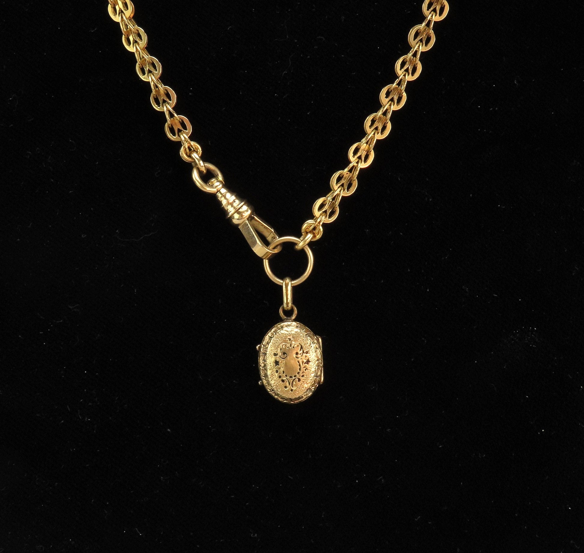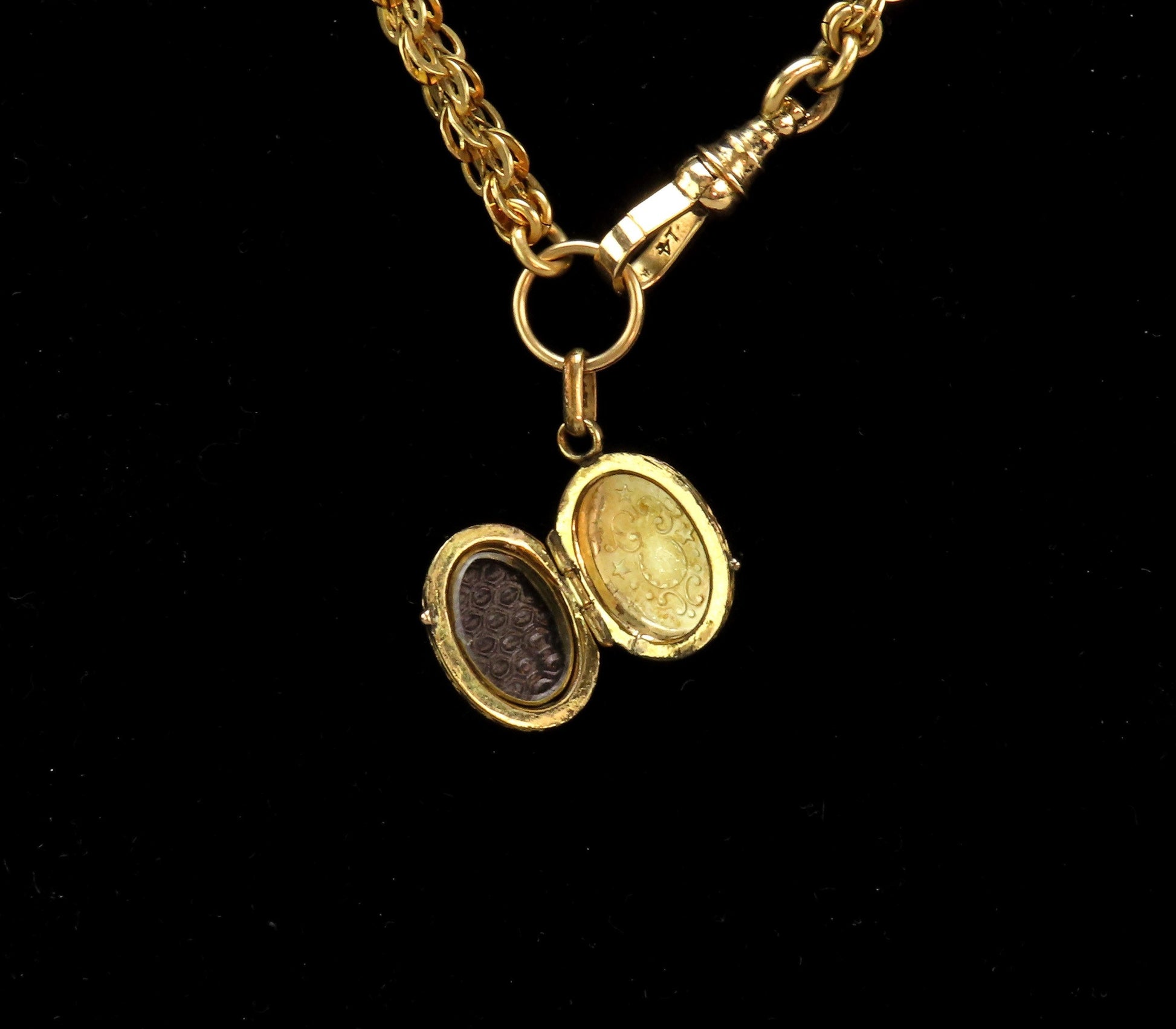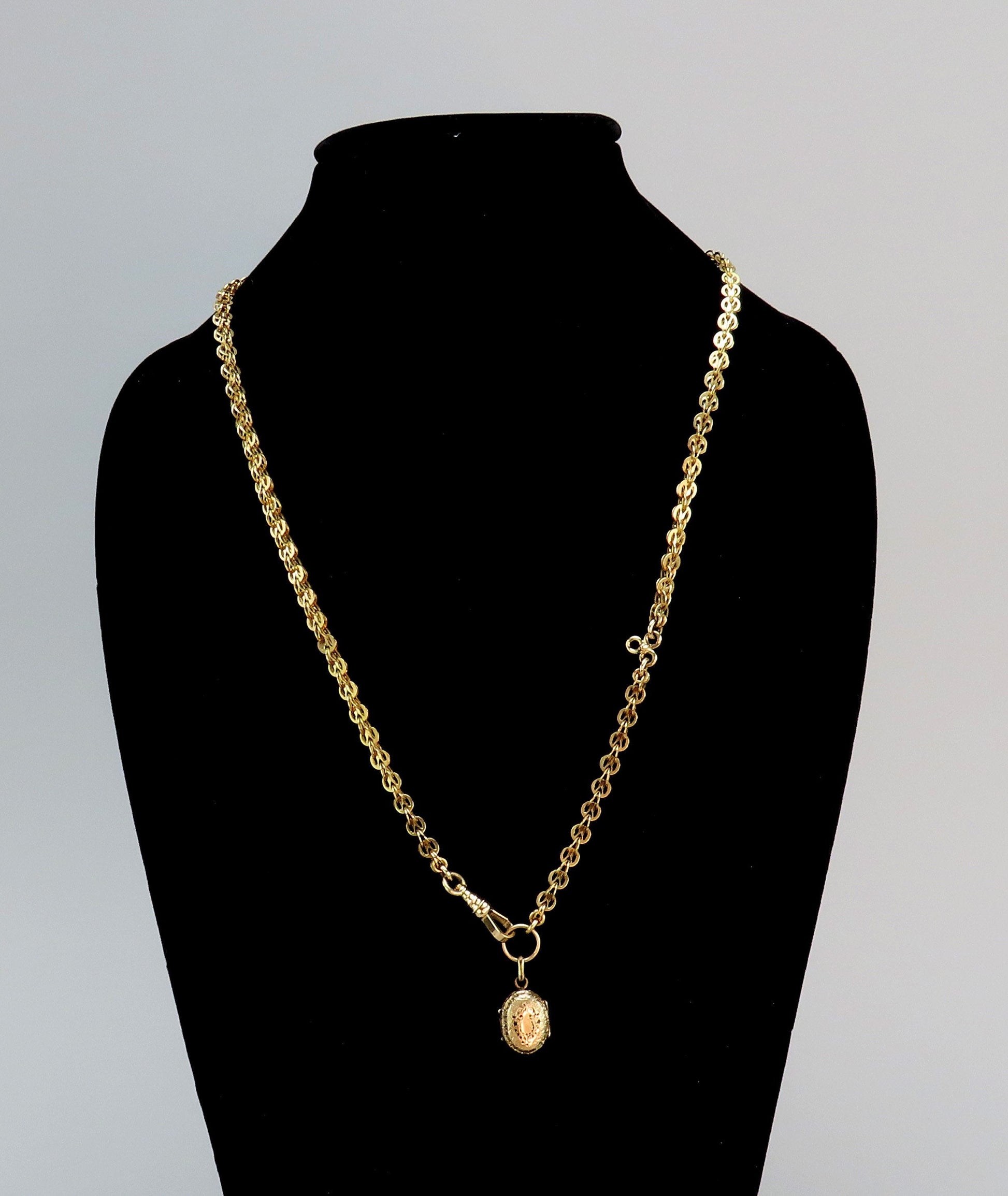 Presented is a fantastic quality antique Victorian 14 karat yellow gold watch chain or necklace, with an attached small gold locket. This piece dates to around the 1840s-1870s, and was made in America. The chain is really the focal point of this listing, it is exceptionally well made by hand with very intricate woven double links, like a combination anchor/foxtail style chain. Truly a level of craftsmanship you just can't find today. This chain would originally have been for a pocket watch and perhaps other ornamental fobs, there is an old dog clip style clasp on one end but just a large round loop on the other, which currently has a little oval locket attached to it. A short ways from the loop at the end is a smaller connector link, with a small loop to attach a T-bar or whatever else you might like. Given the length of the chain, it is easily wearable today as a necklace. The locket is from the same time period as the chain, and is finely engraved front and back as well as decorated with black enamel. The clasp of the chain is stamped 14, for 14 karat gold.