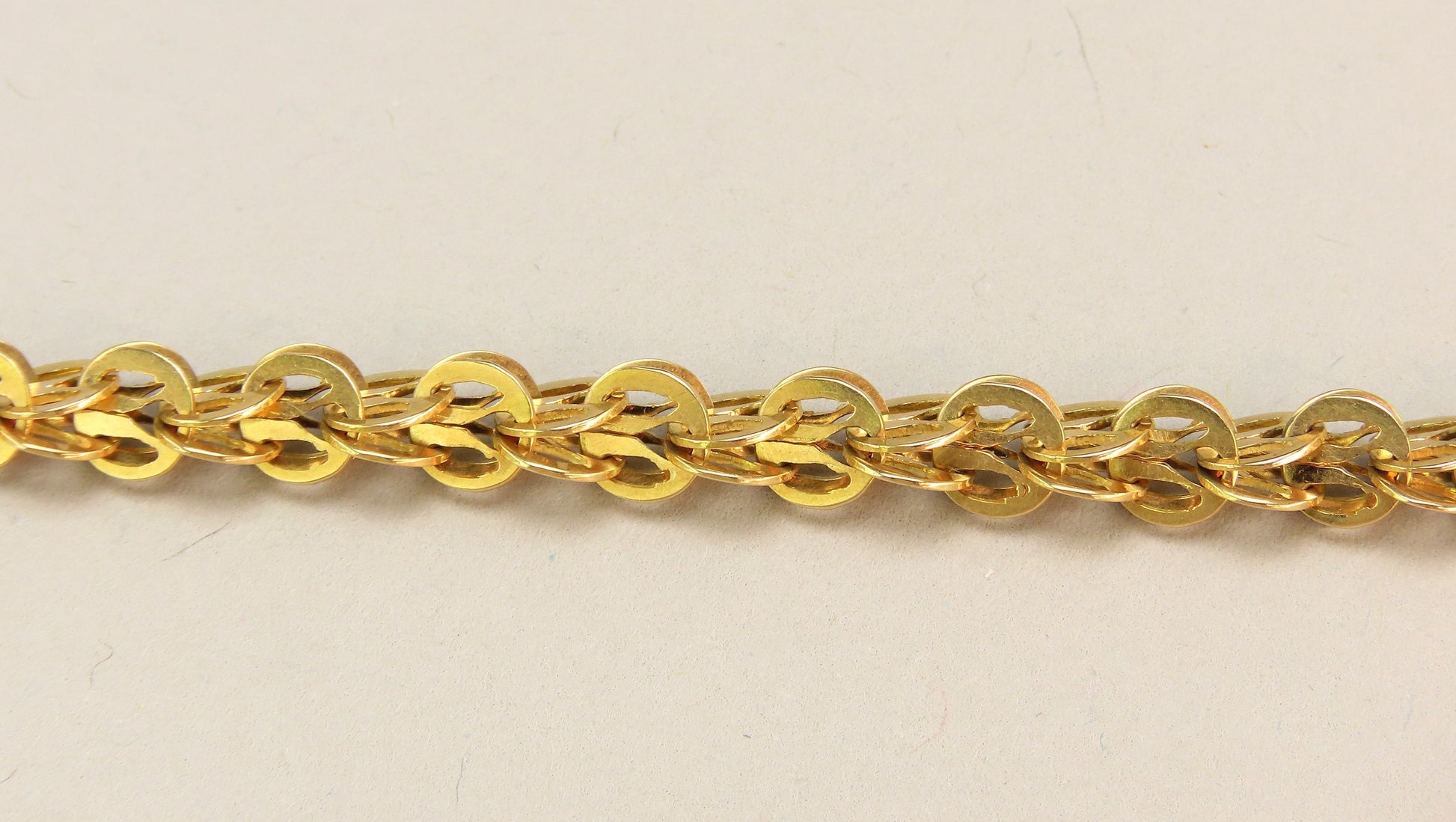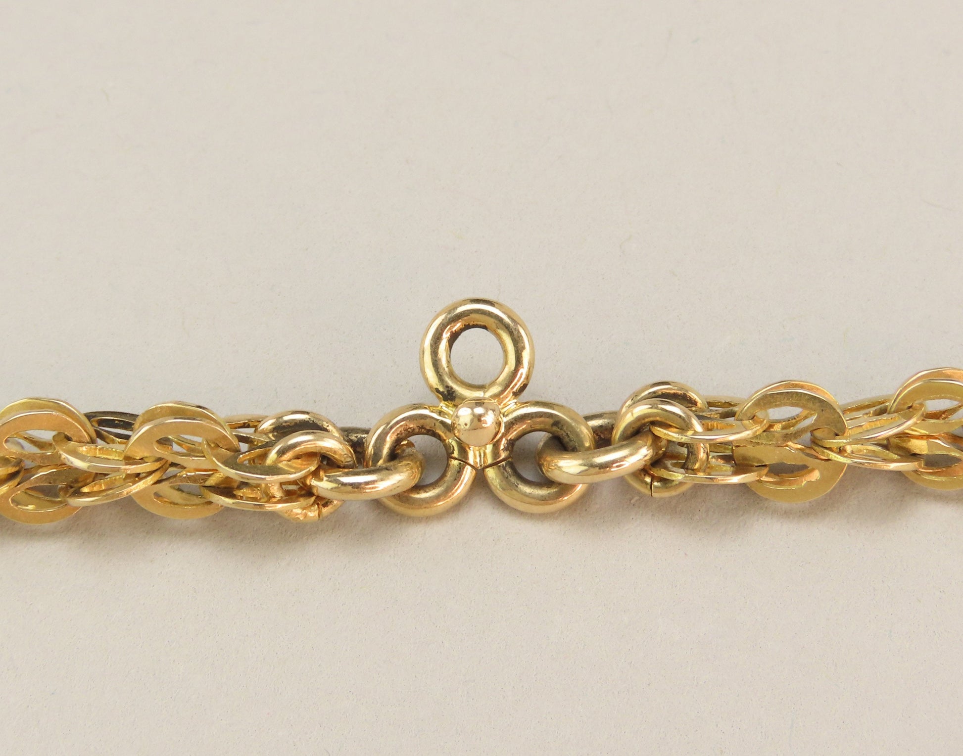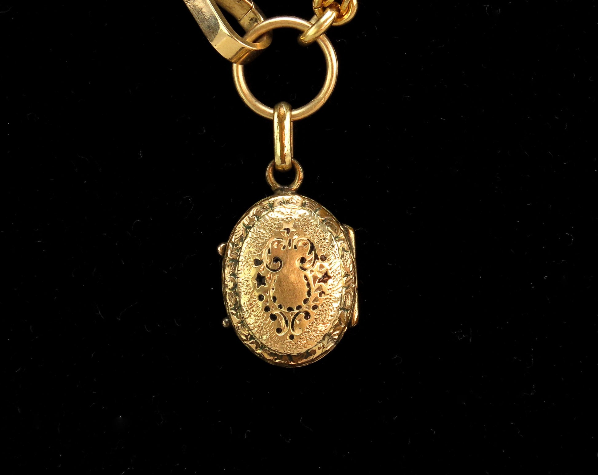 Presented is a fantastic quality antique Victorian 14 karat yellow gold watch chain or necklace, with an attached small gold locket. This piece dates to around the 1840s-1870s, and was made in America. The chain is really the focal point of this listing, it is exceptionally well made by hand with very intricate woven double links, like a combination anchor/foxtail style chain. Truly a level of craftsmanship you just can't find today. This chain would originally have been for a pocket watch and perhaps other ornamental fobs, there is an old dog clip style clasp on one end but just a large round loop on the other, which currently has a little oval locket attached to it. A short ways from the loop at the end is a smaller connector link, with a small loop to attach a T-bar or whatever else you might like. Given the length of the chain, it is easily wearable today as a necklace. The locket is from the same time period as the chain, and is finely engraved front and back as well as decorated with black enamel. The clasp of the chain is stamped 14, for 14 karat gold.