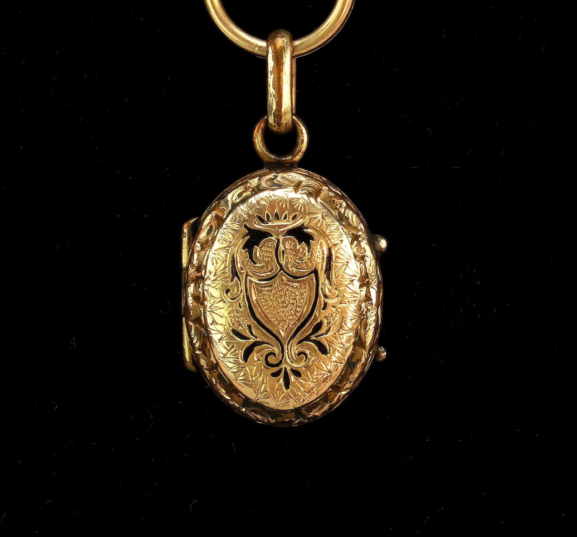 This piece is in great overall condition. The chain is pristine, no kinks or breaks. The locket snaps shut well. The black enamel on the locket has some small losses here and there, hard to notice without close inspection.