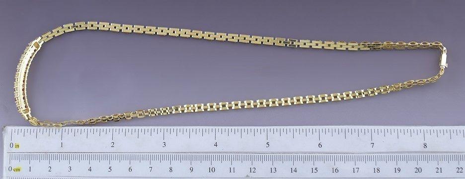necklace is made up of interlocking gold links, in a sort of brickwork style.