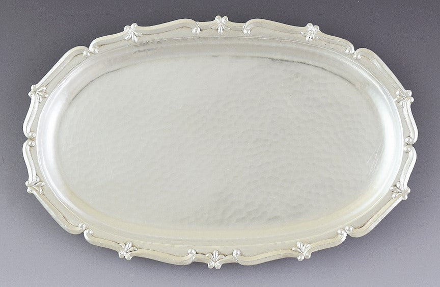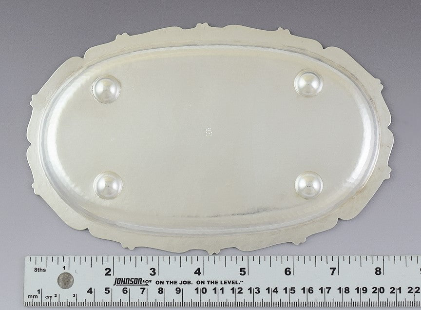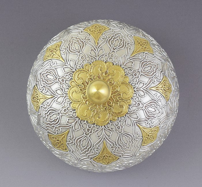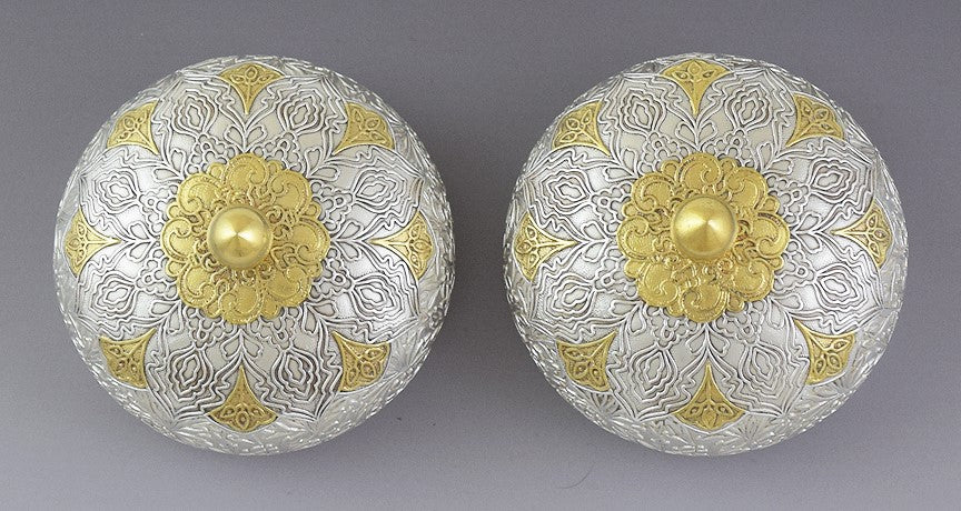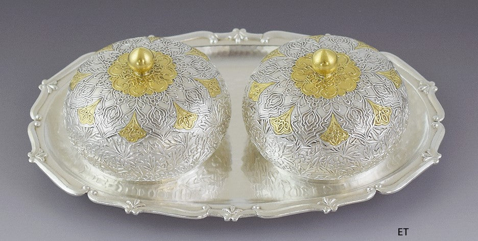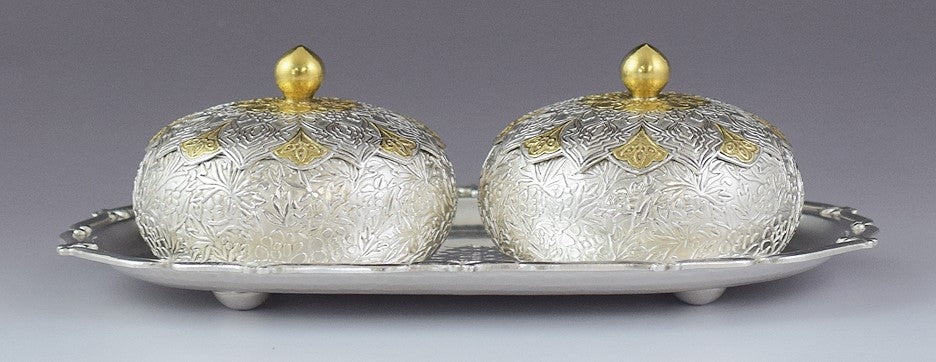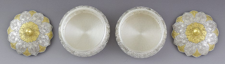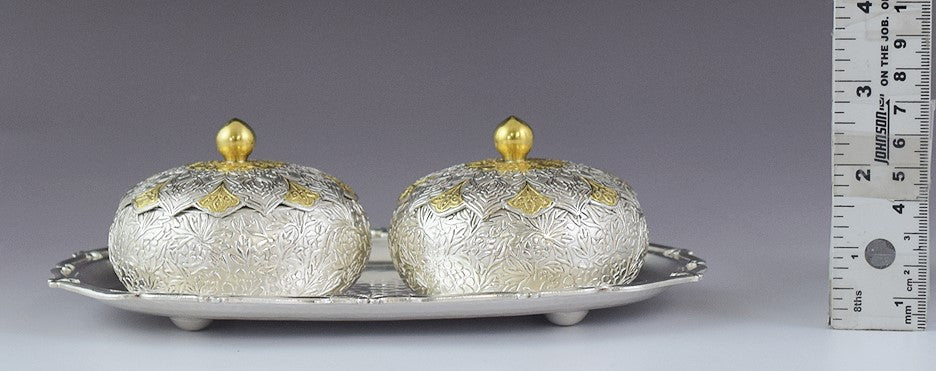 Presented is a superb quality 3 piece Korean silver dish set. This set dates to around the 1960s-1970s. The dish is made from 99% pure silver, which is a distinctly higher standard than sterling 925 (92.5%). The set consists of two little covered dishes on a tray. The lid of each dish is beautifully decorated with raised stylized lotus flower and leaf designs, against a finely textured background. The designs are done in both bright silver and gilt, so they really stand out. The sides of the dishes have a design of small flowers and leaves, very lush and densely set. The lid of each dish is done in the form of a plum or other fruit, with a rich gold wash. The tray has a rim of scroll and foliate decoration in a simple style, and stands on four round feet. We are unsure what the purpose of these little dishes is, whether this is a dresser set for storing trinkets or cosmetics, or if this is a serving set for condiments, etc. However it's put to use, this is a beautiful set.